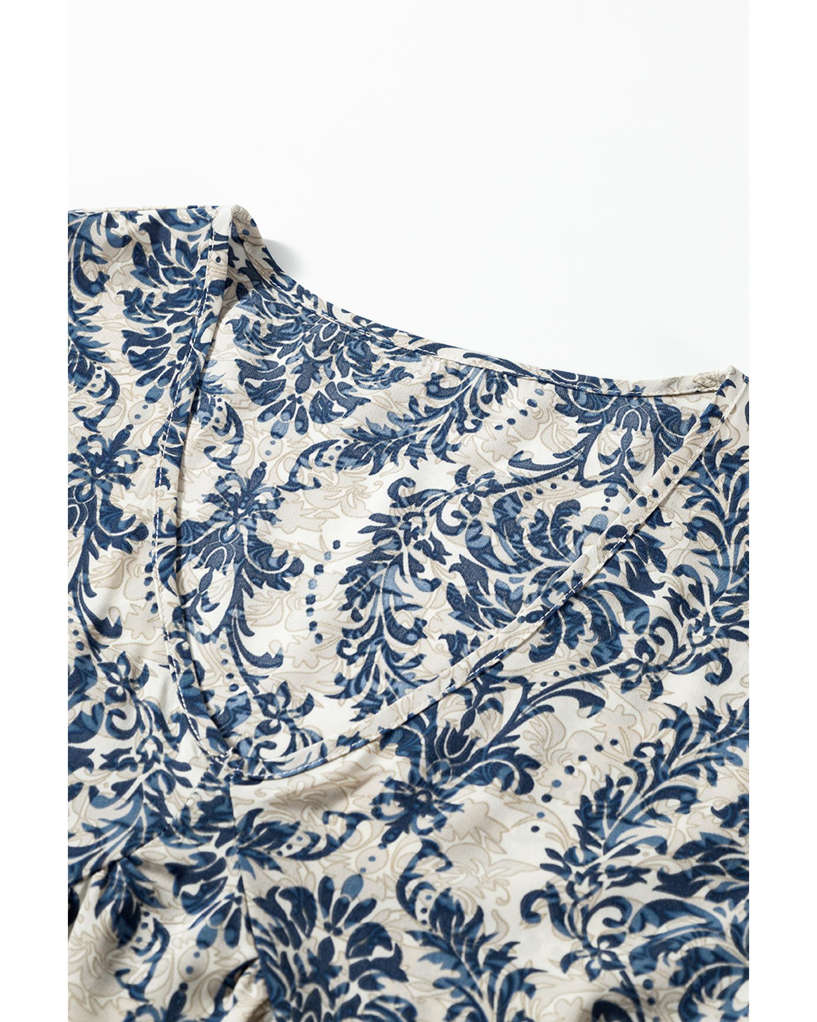 Sky Blue Vintage Printed Lace Trim V Neck 3/4 Sleeve Loose Dress - L