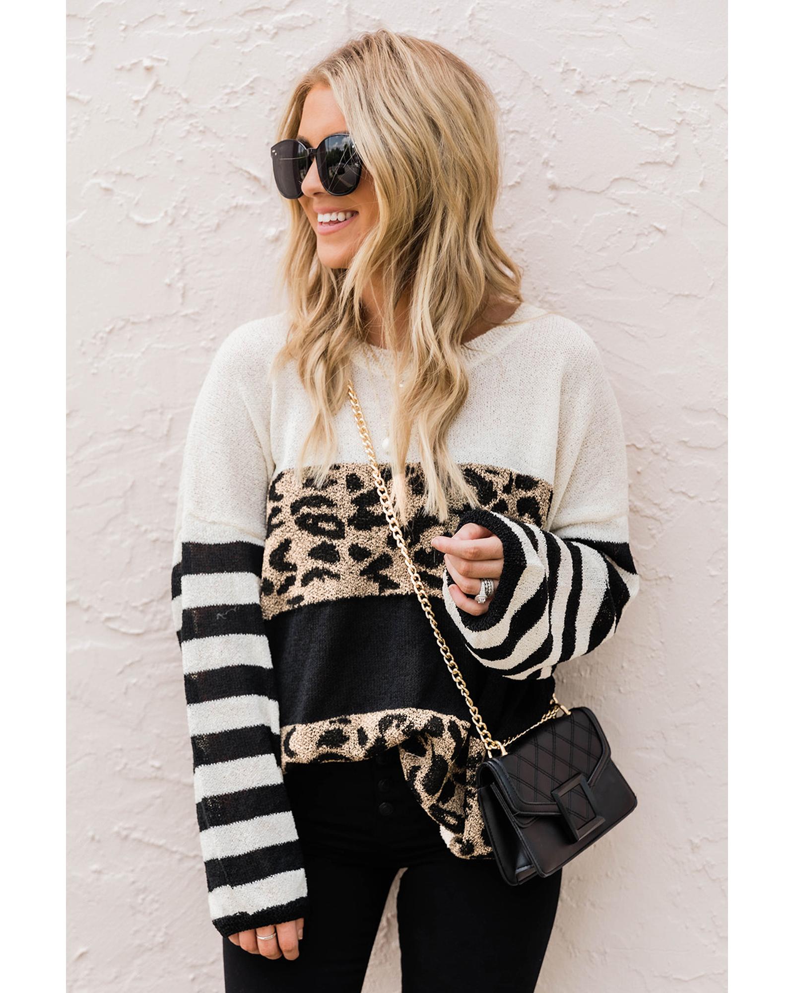 Slouchy drop - shoulder leopard striped colorblock sweater Round neck drop shoulder long sleeves and loose fit style Pairs well with any pants skirts bags and shoes Made with high