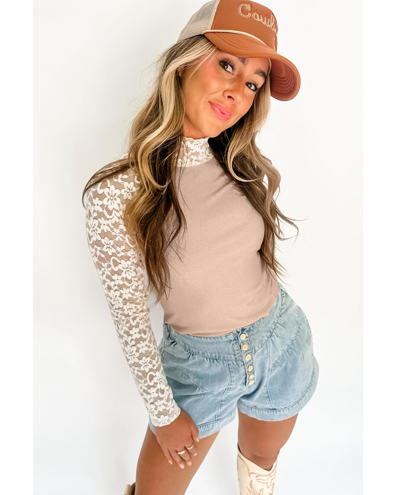 Smoke Gray Floral Lace Patchwork Long Sleeve High Neck Slim Top – S