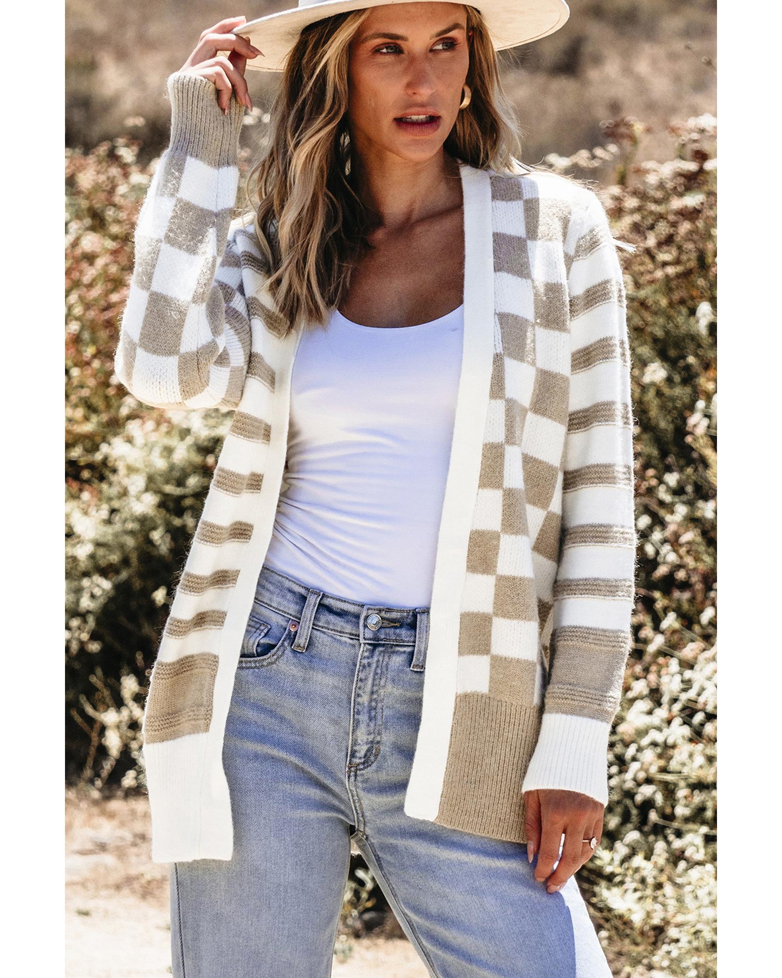 Smoke Gray Gingham Striped Knitted Open Front Cardigan – L