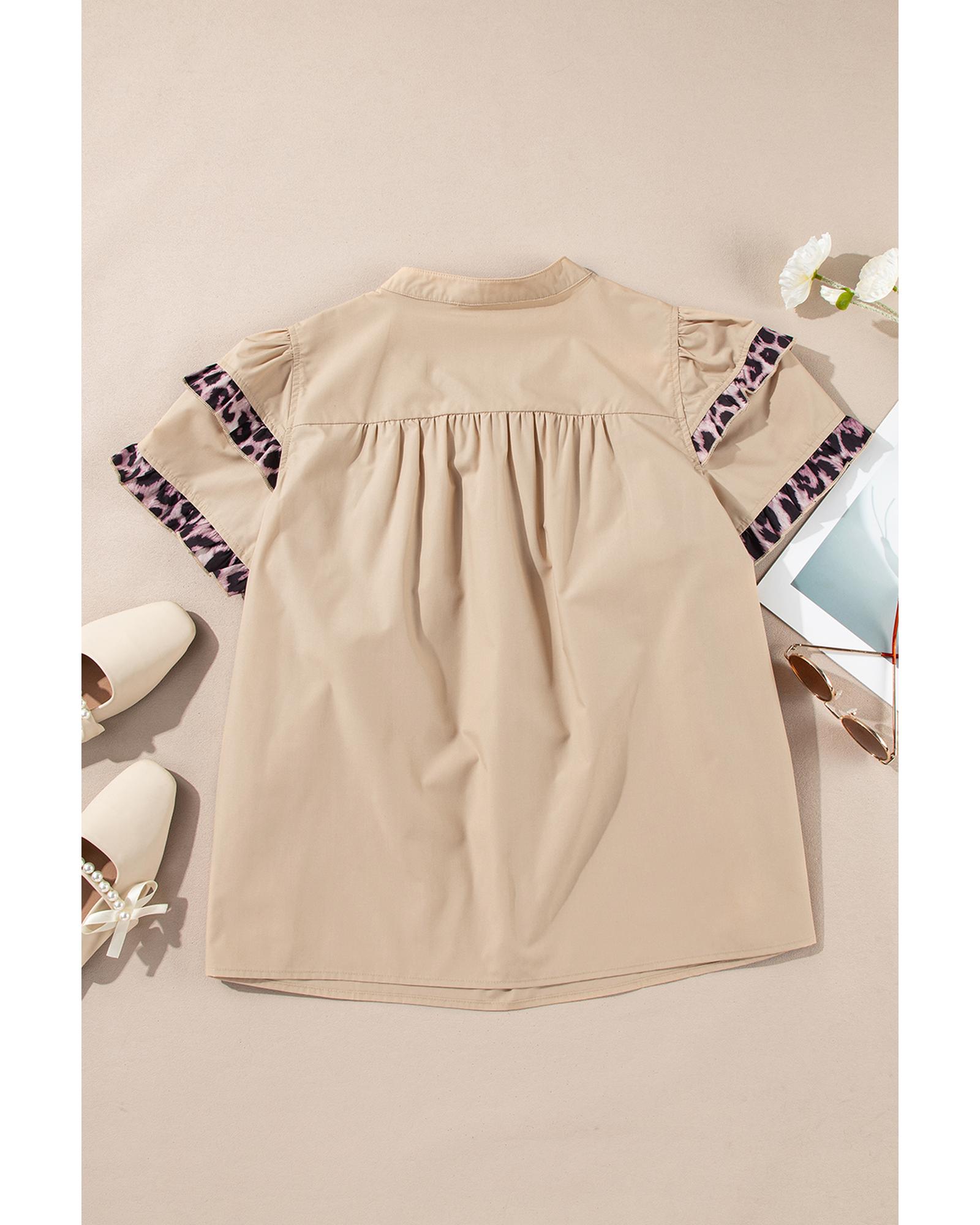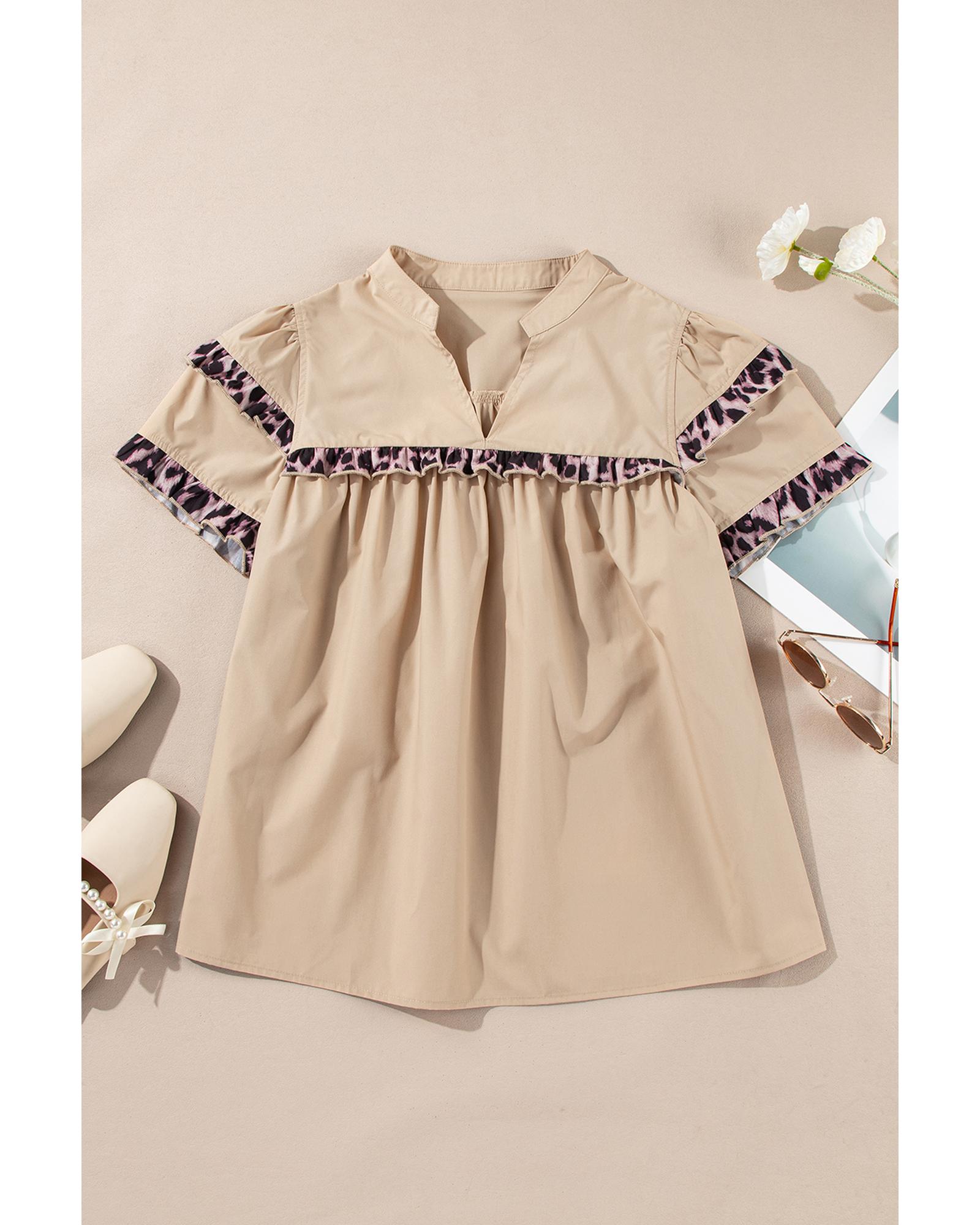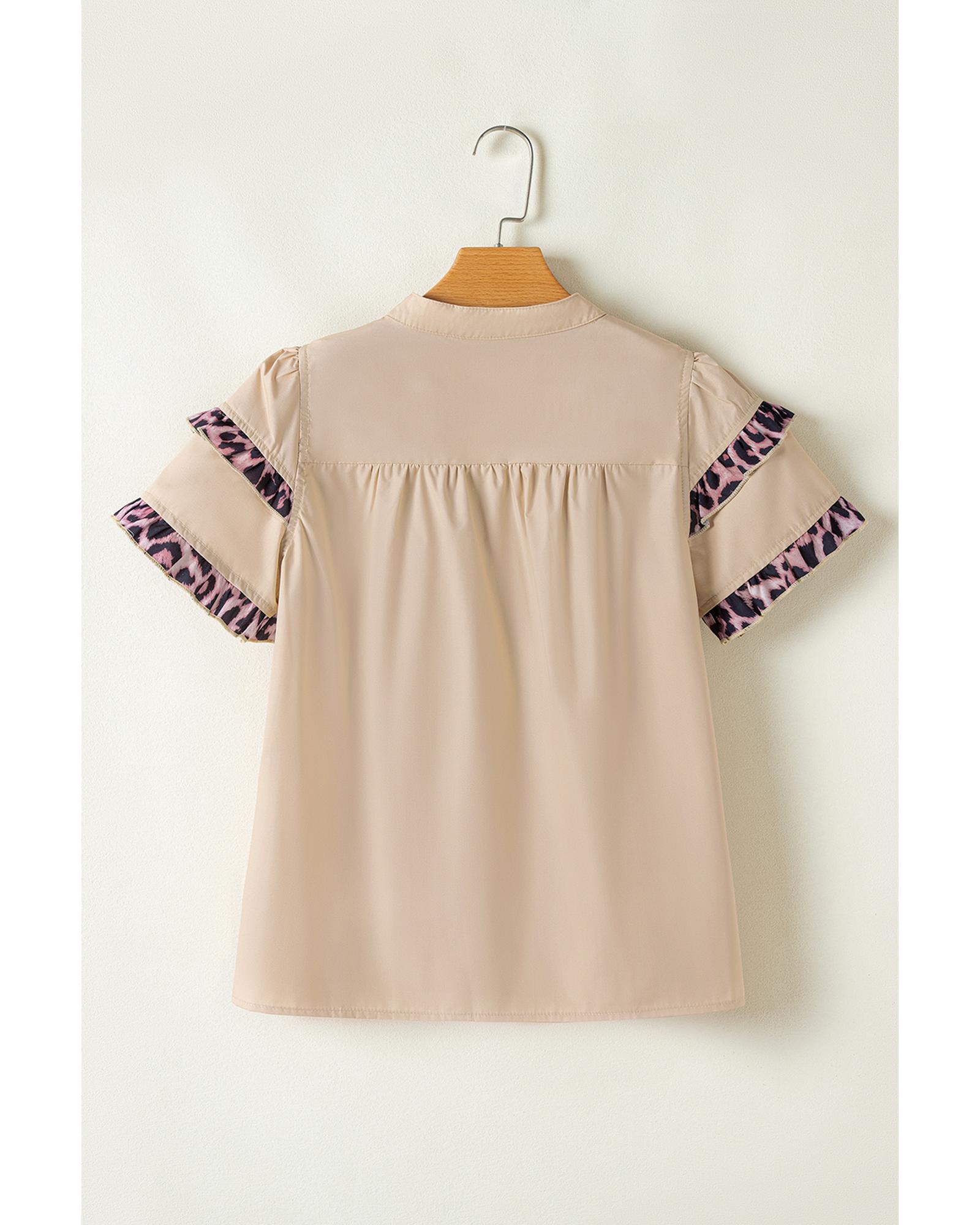 Smoke Gray Leopard Ruffles Trim Tiered Short Sleeve Blouse – M