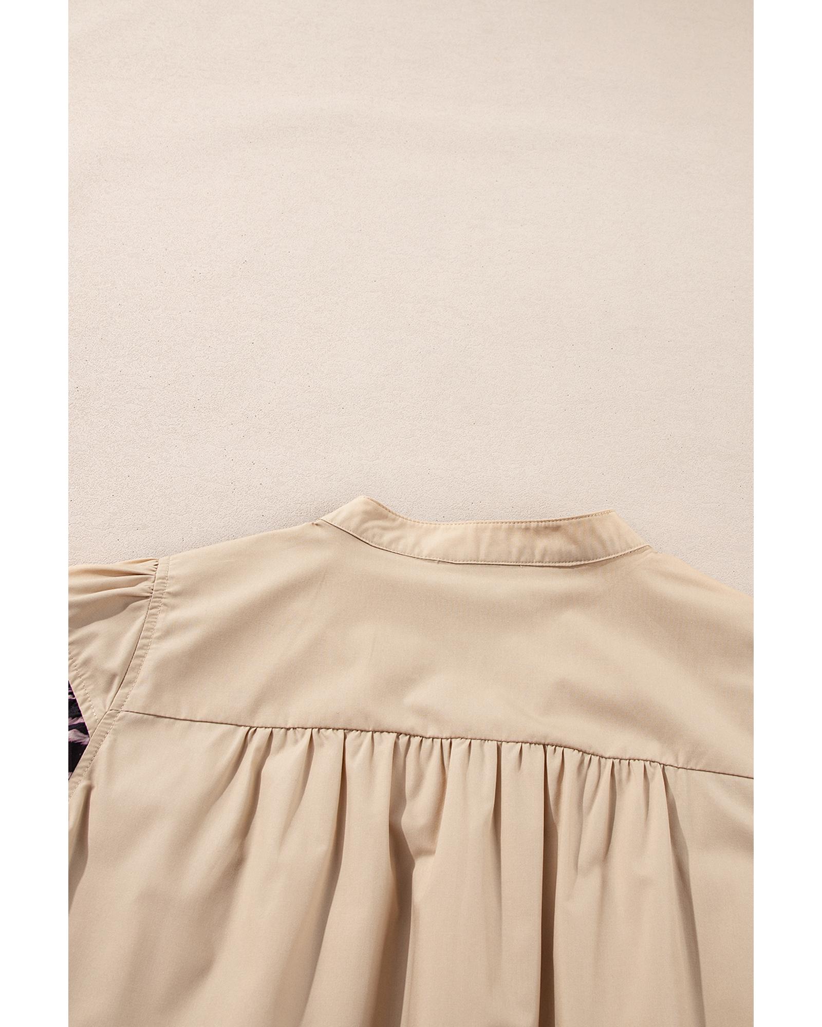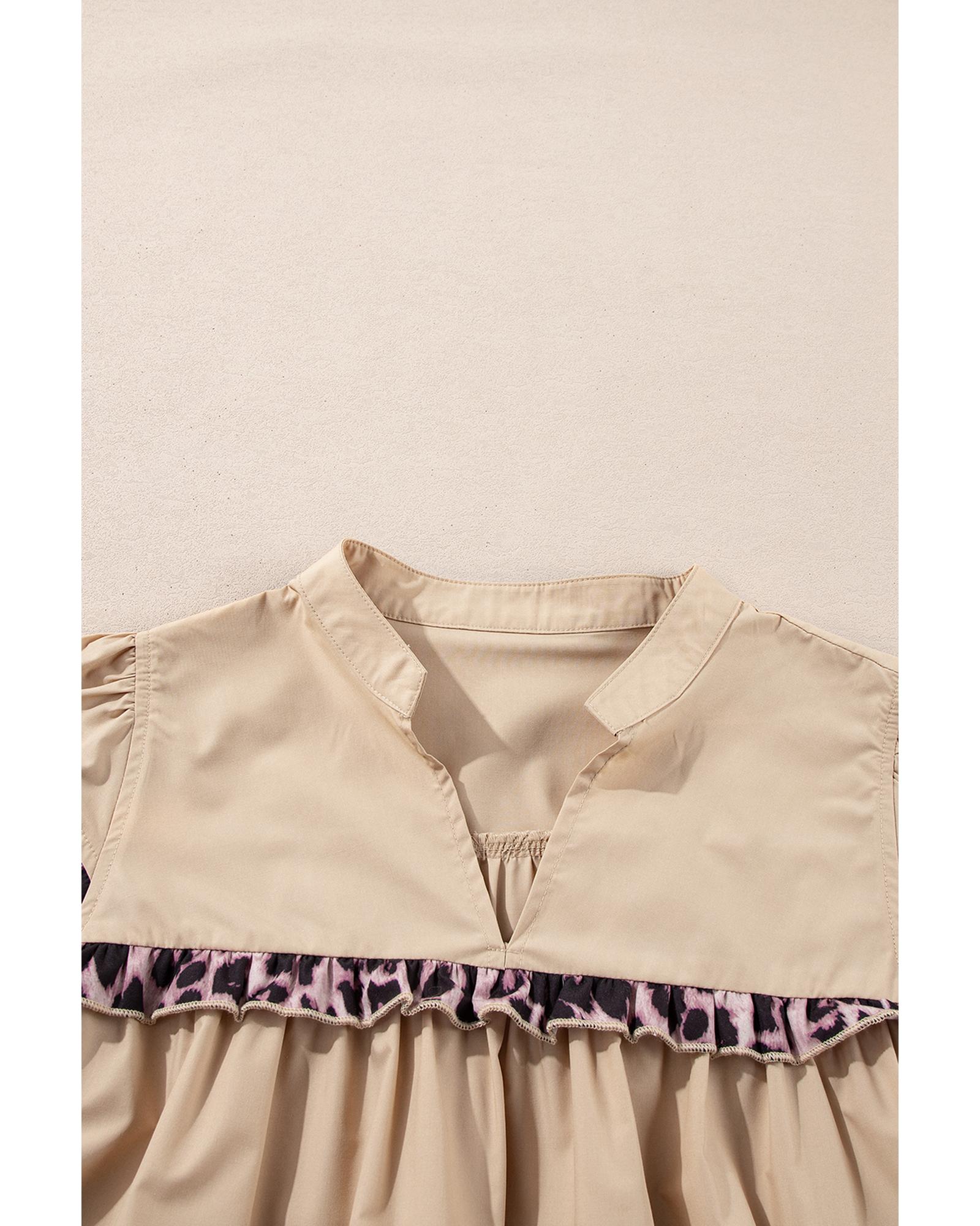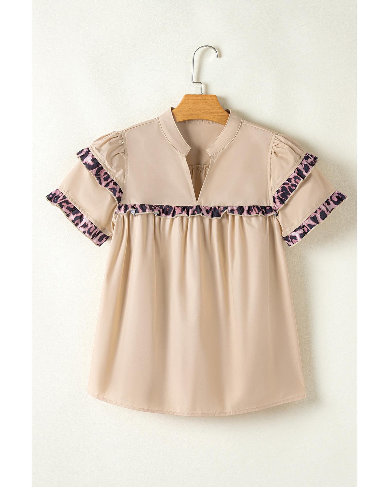Smoke Gray Leopard Ruffles Trim Tiered Short Sleeve Blouse – S