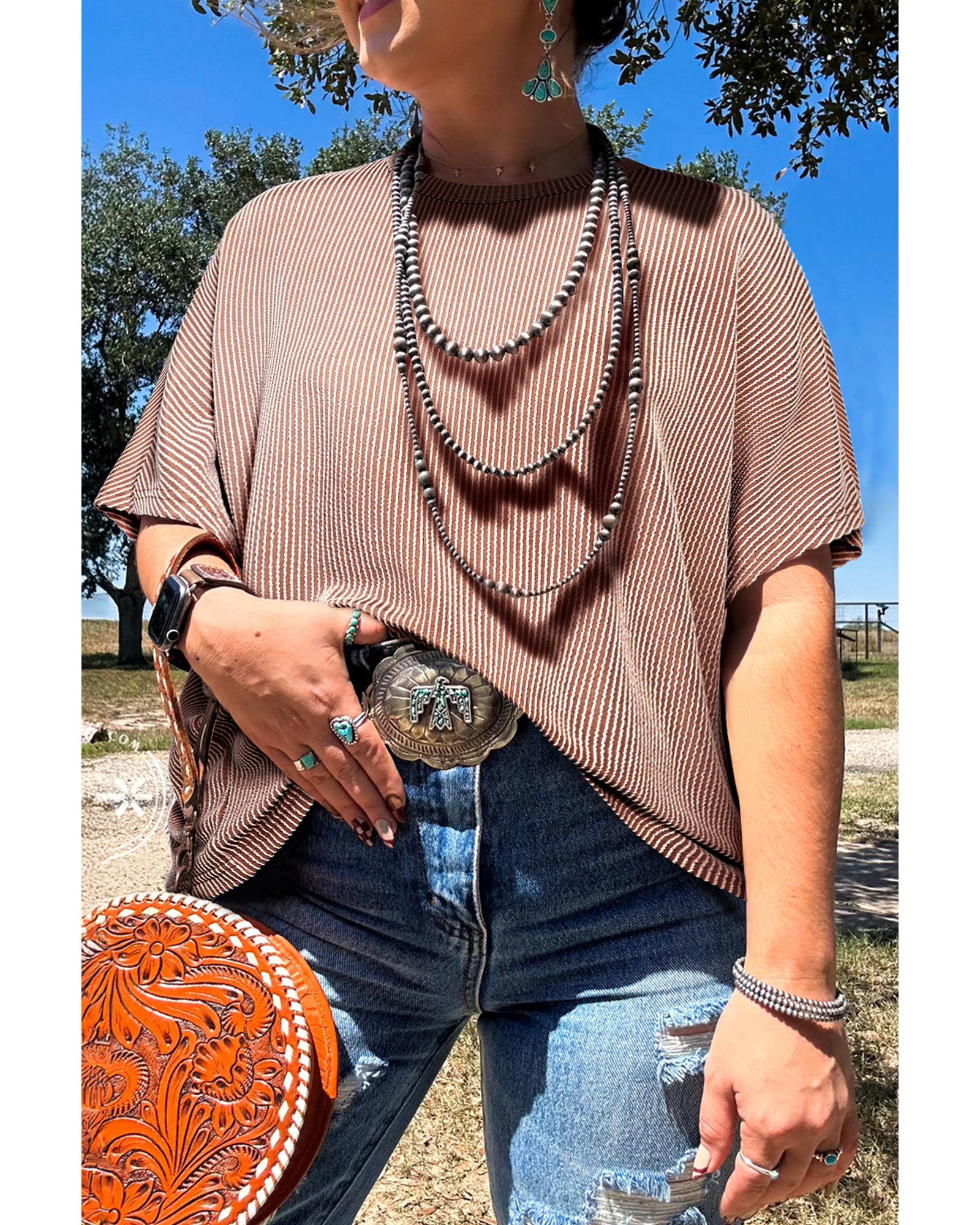 Smoke Gray Ribbed Striped Crew Neck Plus Size Knit T Shirt – 4X