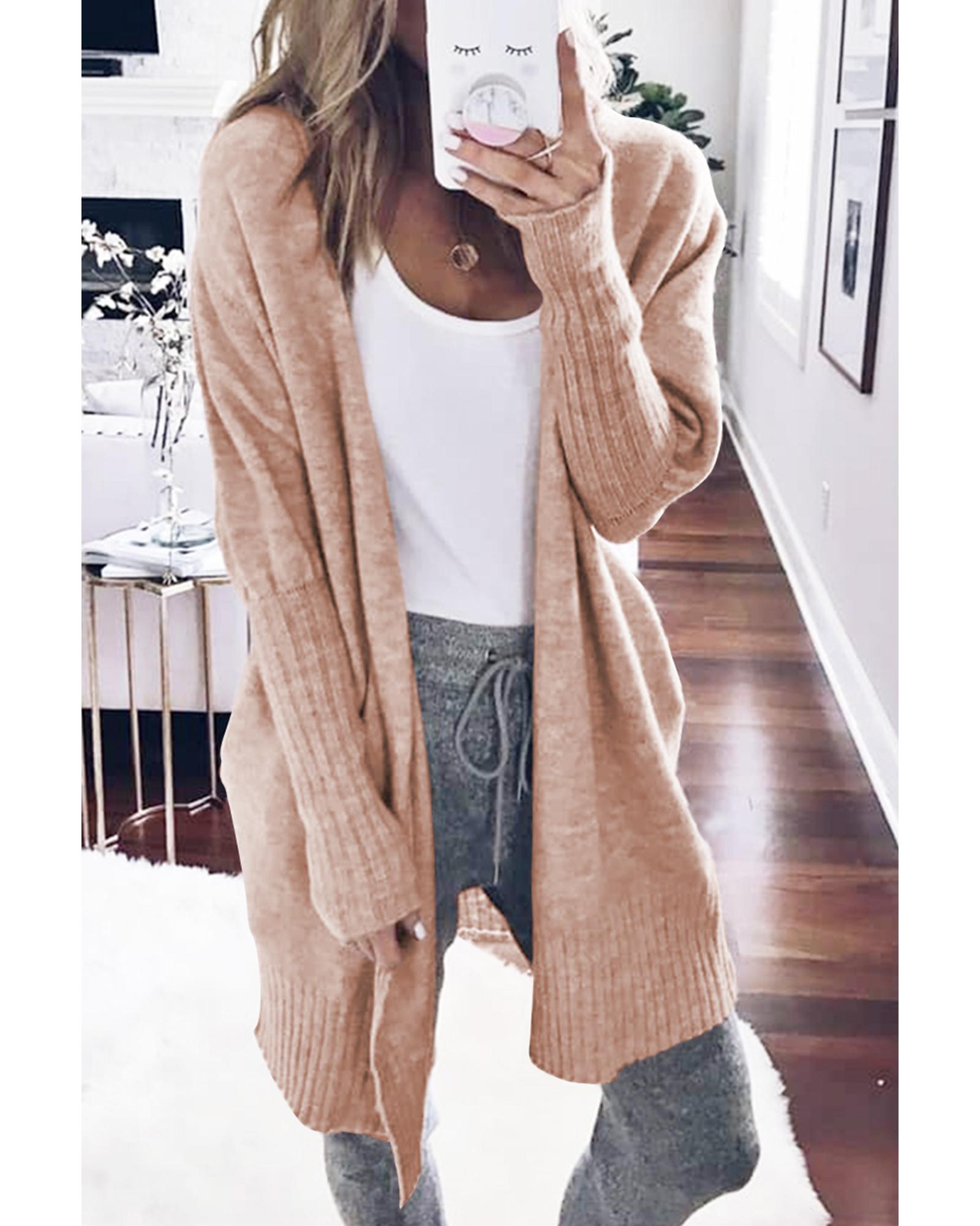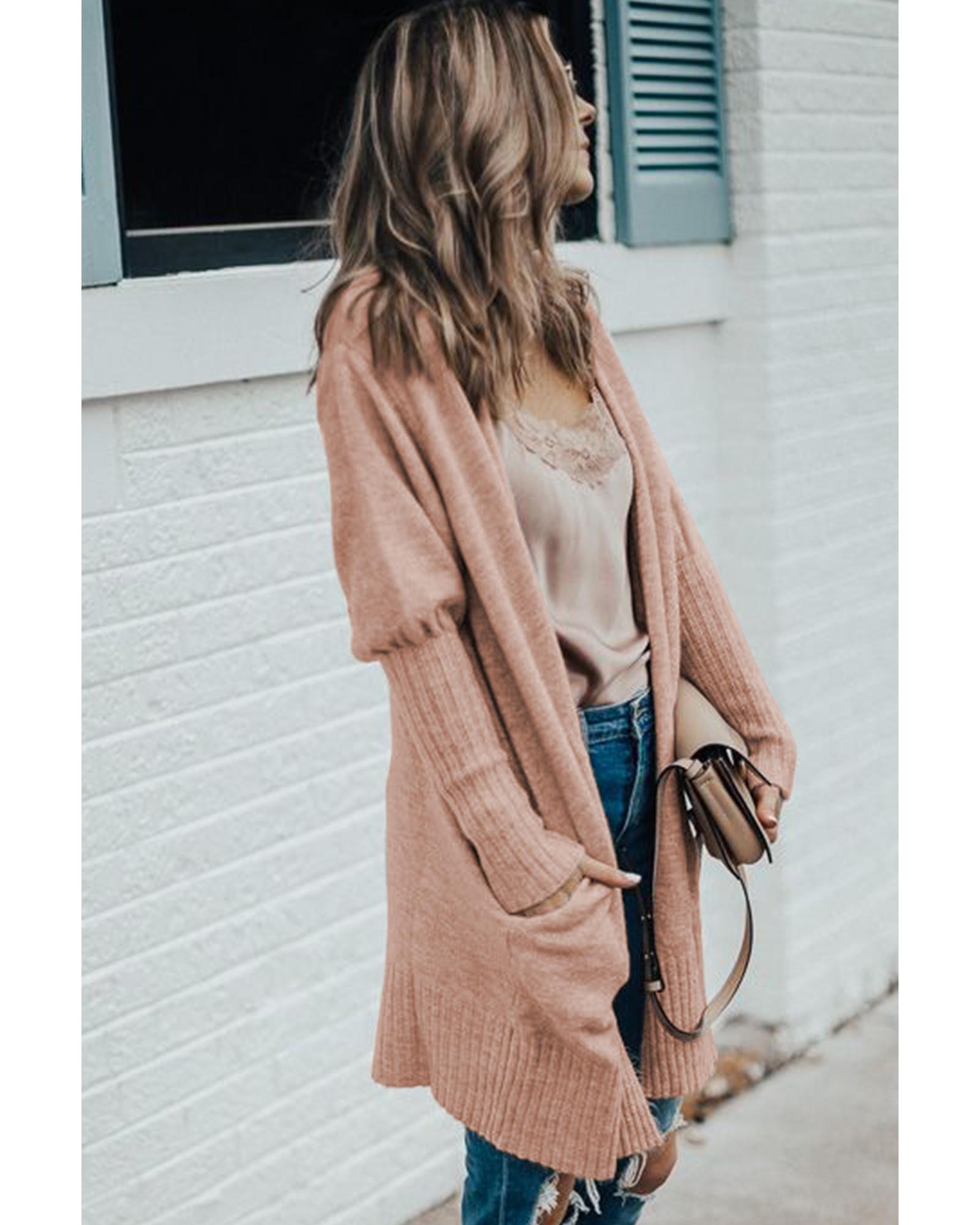 Smoke Gray Ribbed Trim Puff Sleeve Open Cardigan – M