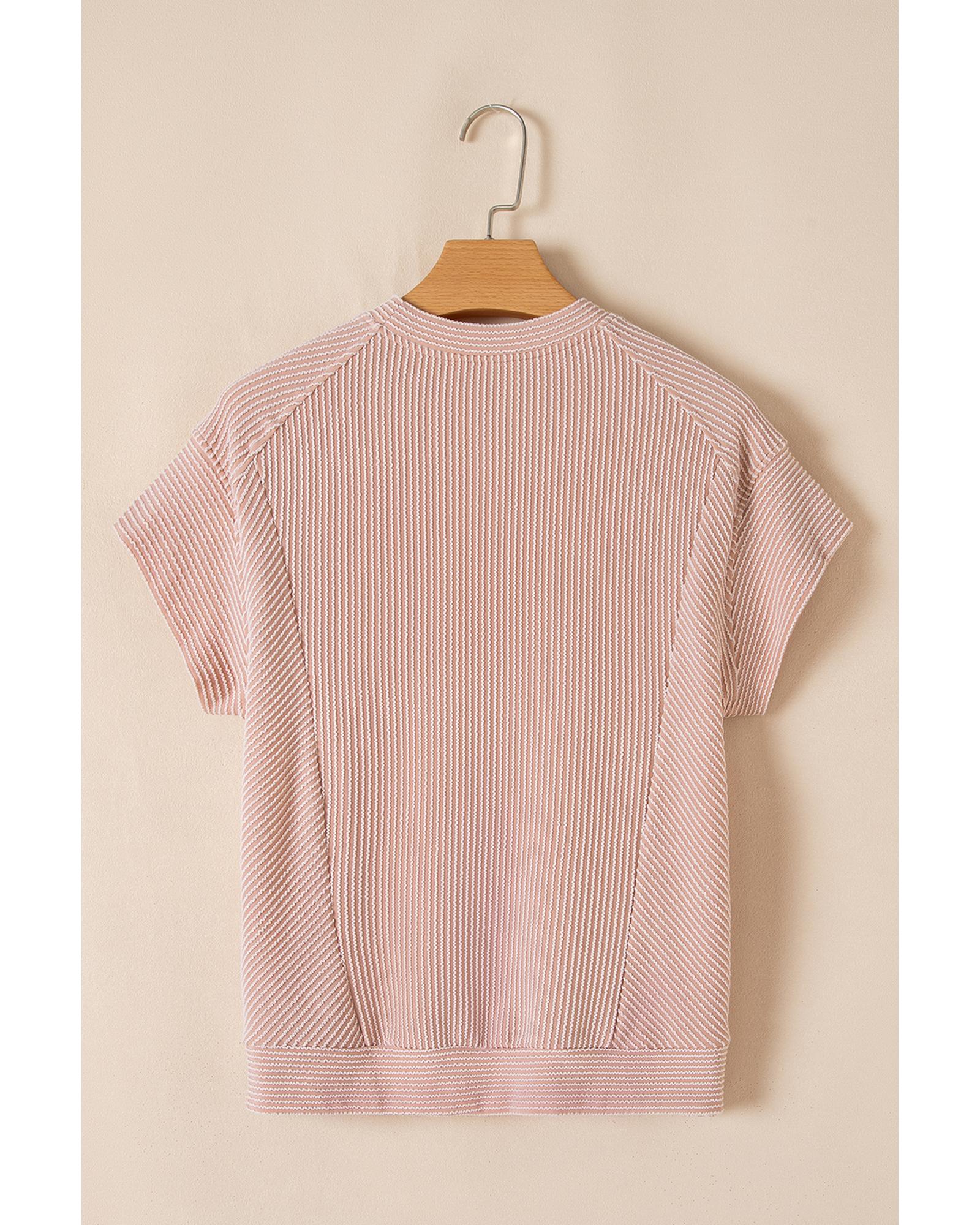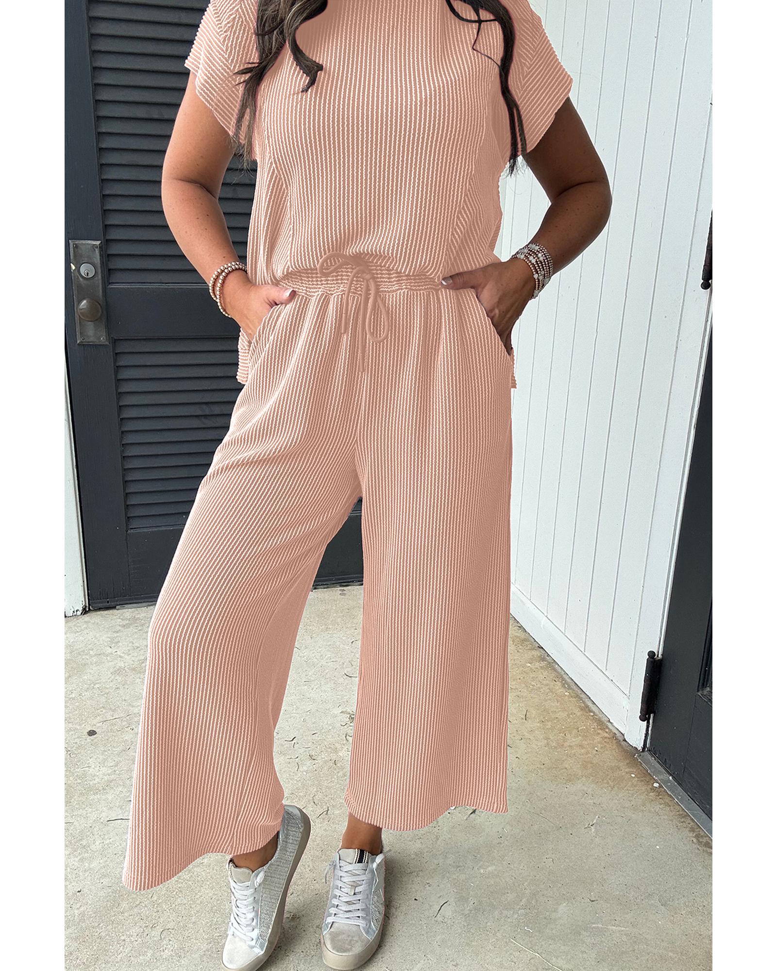 Pink Corded Colorblock Patchwork Short Sleeve Top and Loose Pants Set - S