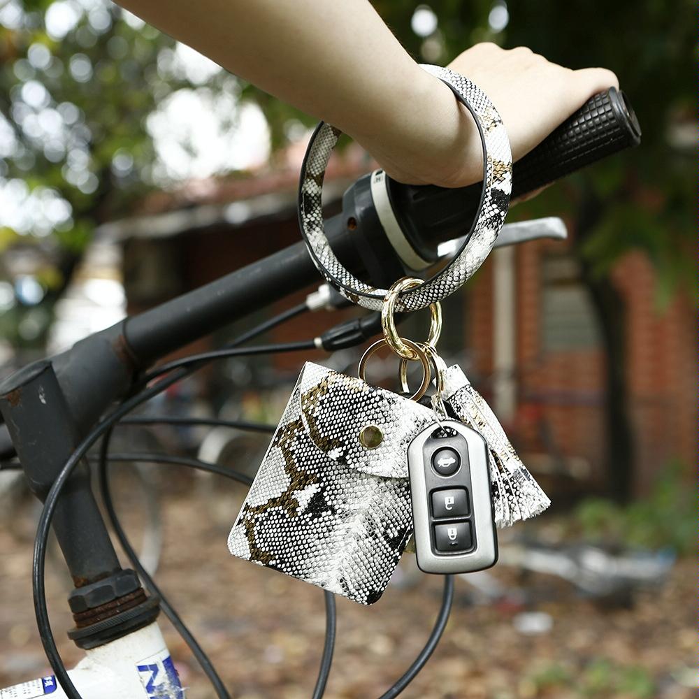 Snake Print Wrist Keychain Coin Purse Black Pu Leather Bracelet Card Case - Black