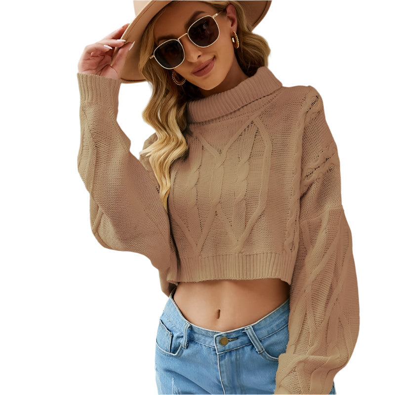 Solid Colour High Neck Pullover Knitted Top Short Stranded Flowers Knitted Sweater – Camel – M