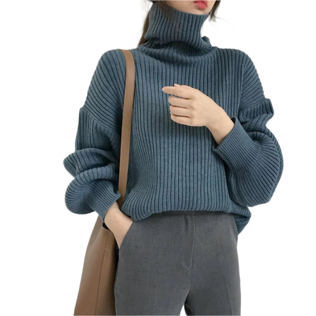Solid Colour Turtleneck Outer Wear Pullover Casual Sweater Beige – Free Size – Blue Grey Free Size