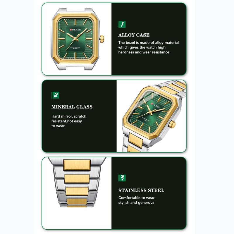 Square Steel Strap Men Quartz Watch – Business Style – Gold Green