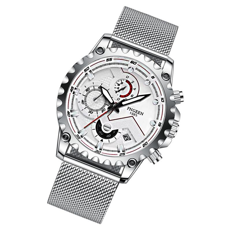 Stainless Steel Waterproof Men Sports Watch – Black Leather White Steel Black Surface
