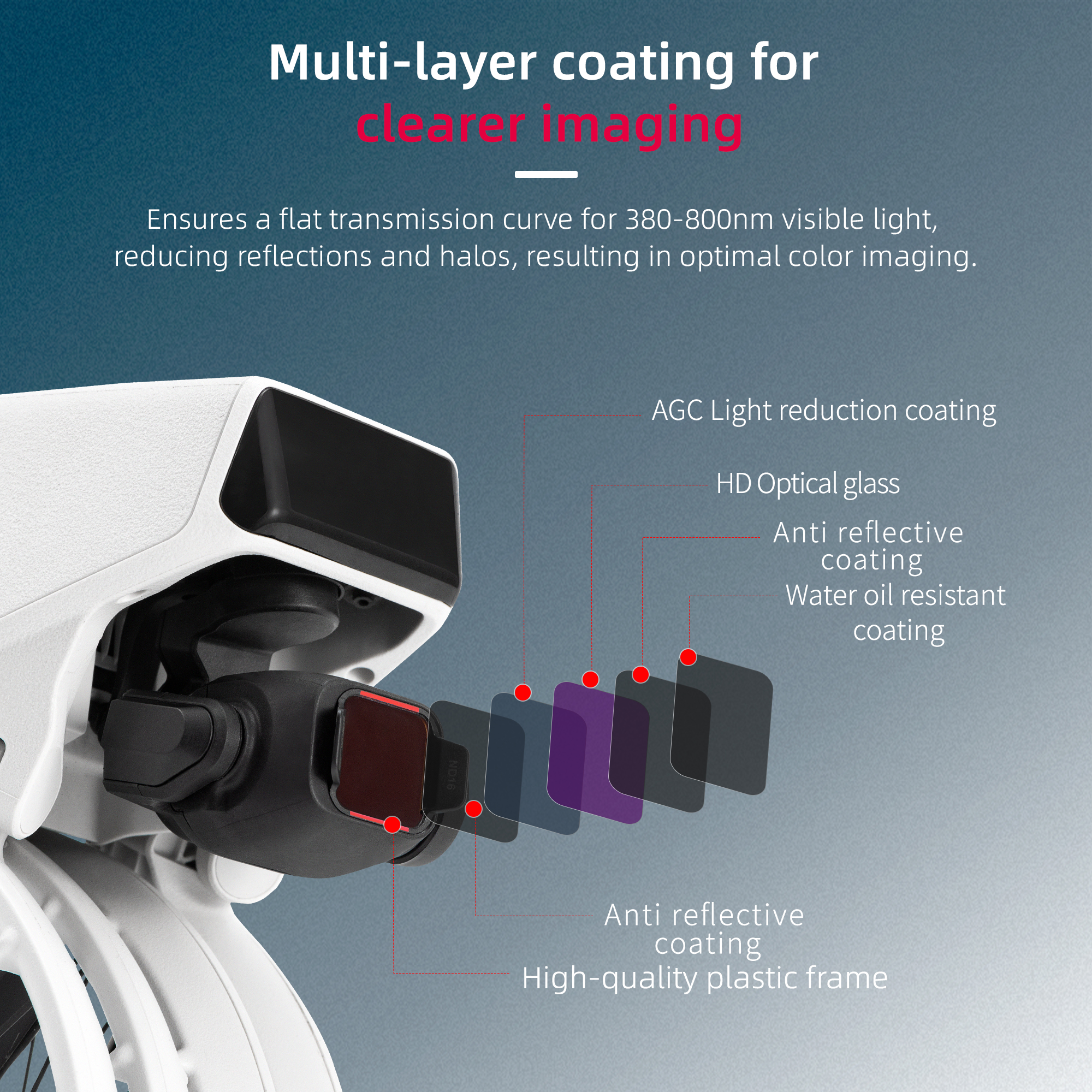 - Multi-Layer Coating:Each filter is made of high-definition optical glass, which has been ground and polished many times, with more than 30 layers of coatings, which is waterproof, anti-scratch, dustproof, and oil-proof, and protects your drone lens from all-around injuries