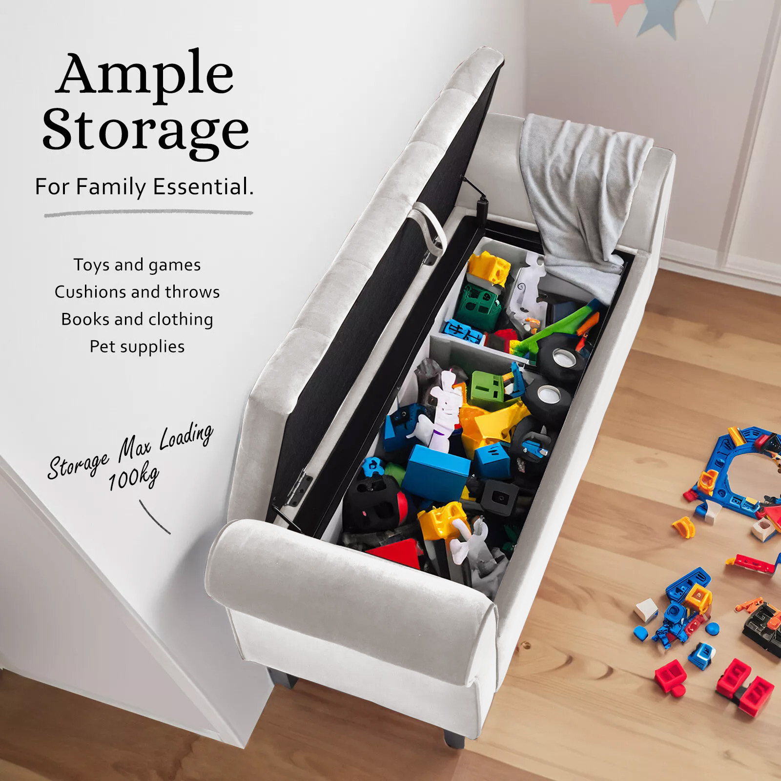Meet our Velvet Ottoman Storage with Rolled Armrest – a chic and useful addition to your living space. Covered in soft velvet and cushioned with comfy foam, it’s a cozy seat with style. Supported by strong wooden legs, this piece is a perfect blend of classic and robust design.