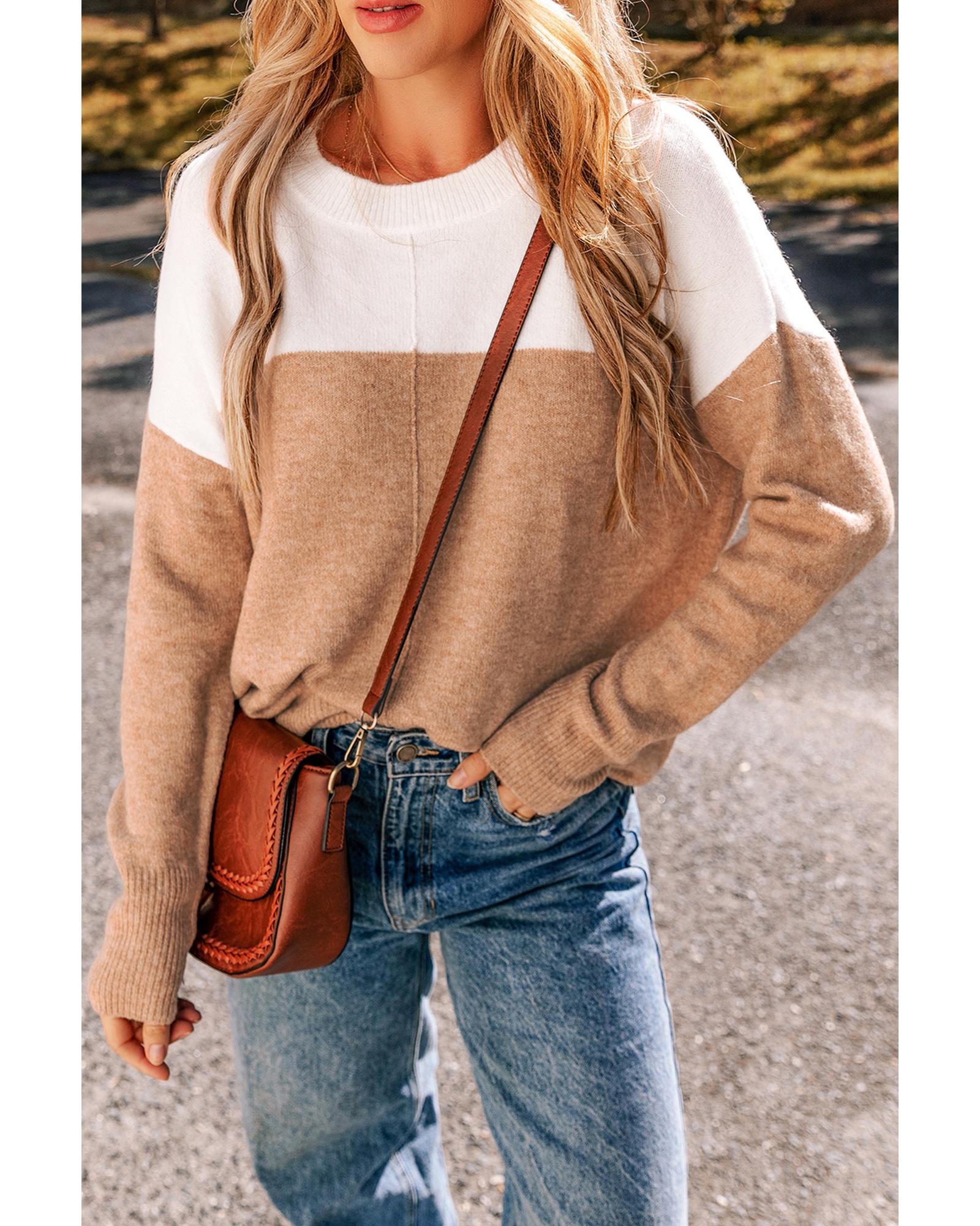 Straw Yellow Colorblock Ribbed Trim Round Neck Sweater - S