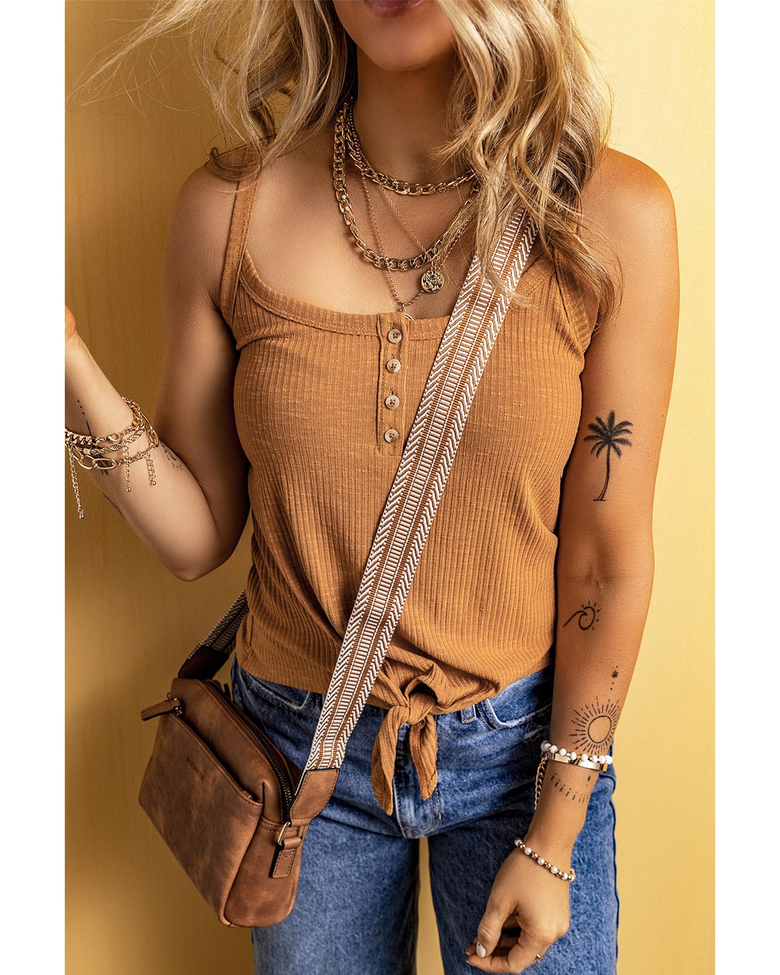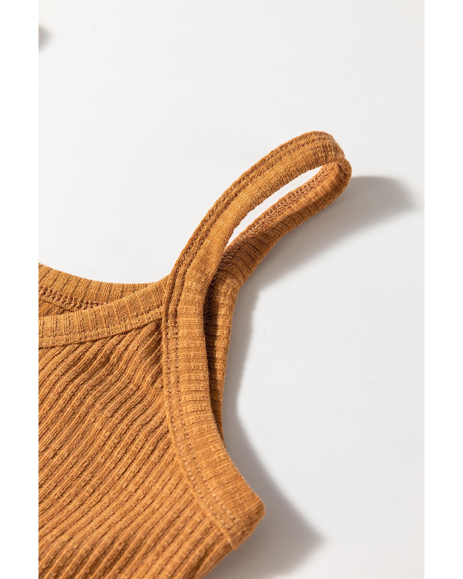 Straw Yellow Ribbed Front Knot Buttoned Thin Strap Tank Top – S