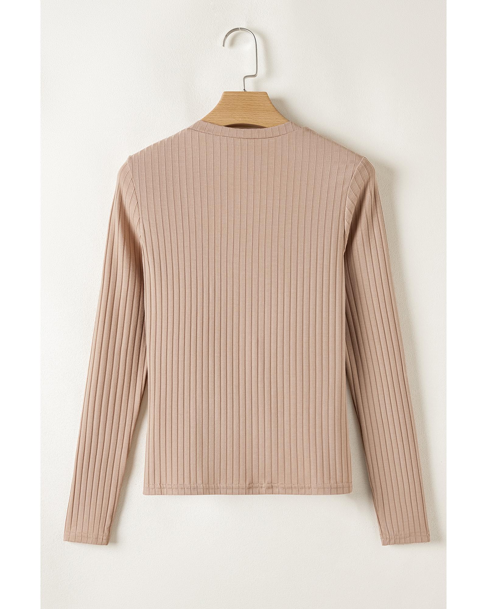 Straw Yellow Ribbed Knit V Neck Long Sleeve Slim Fit Top - L
