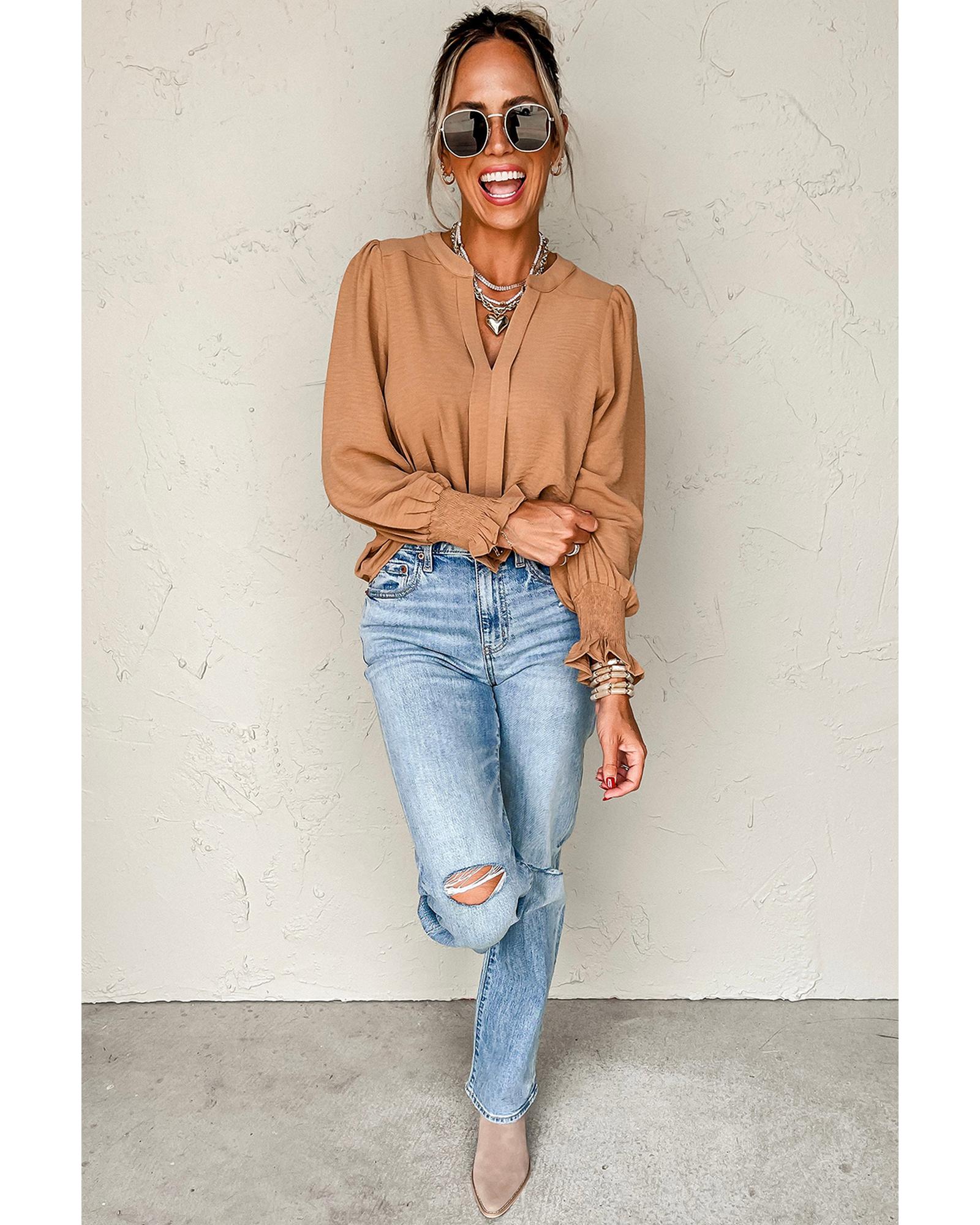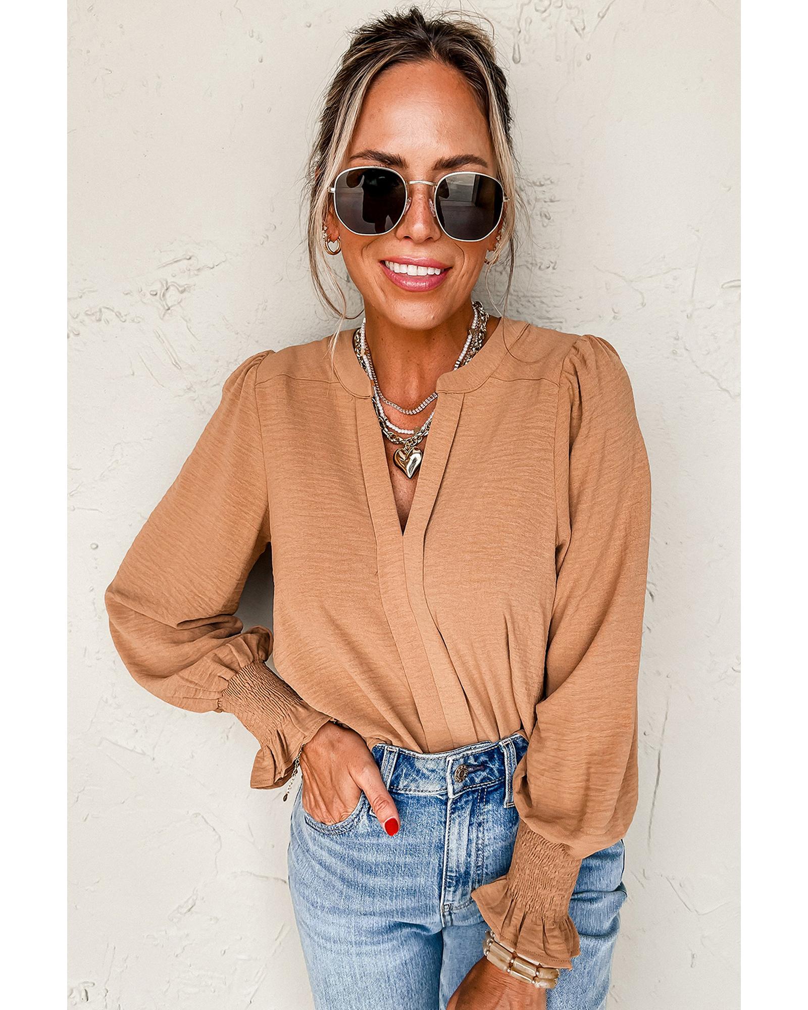 Straw Yellow Solid Color Shirred Cuff Notch V Neck Blouse – S