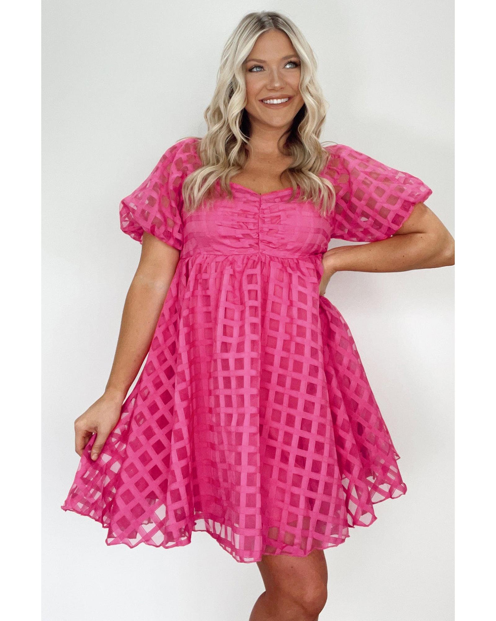 - Chic and classic Strawberry Pink Checkered Puff Sleeve Babydoll Dress
