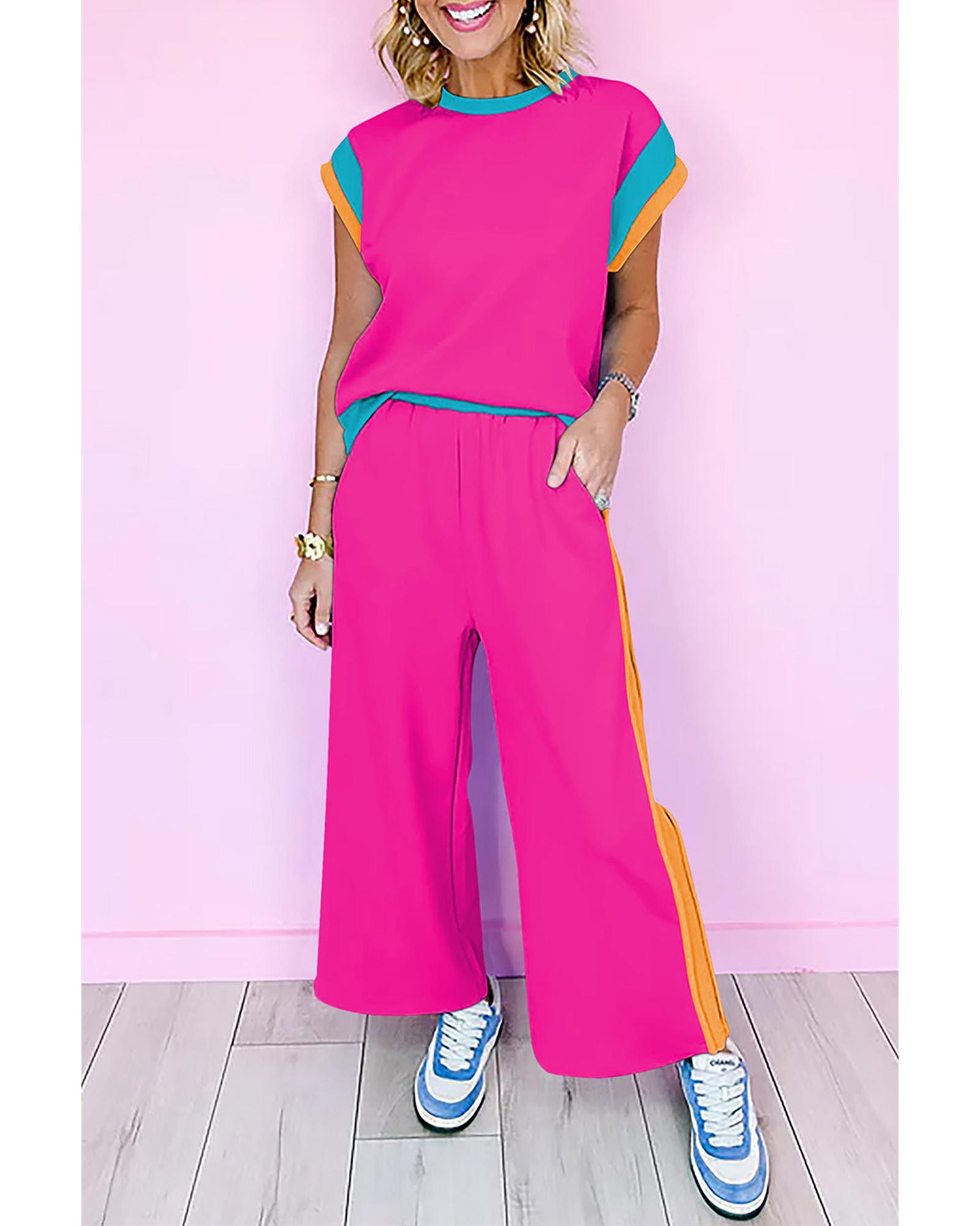 Strawberry Pink Color Block Detail Casual Two-piece Set – 2XL