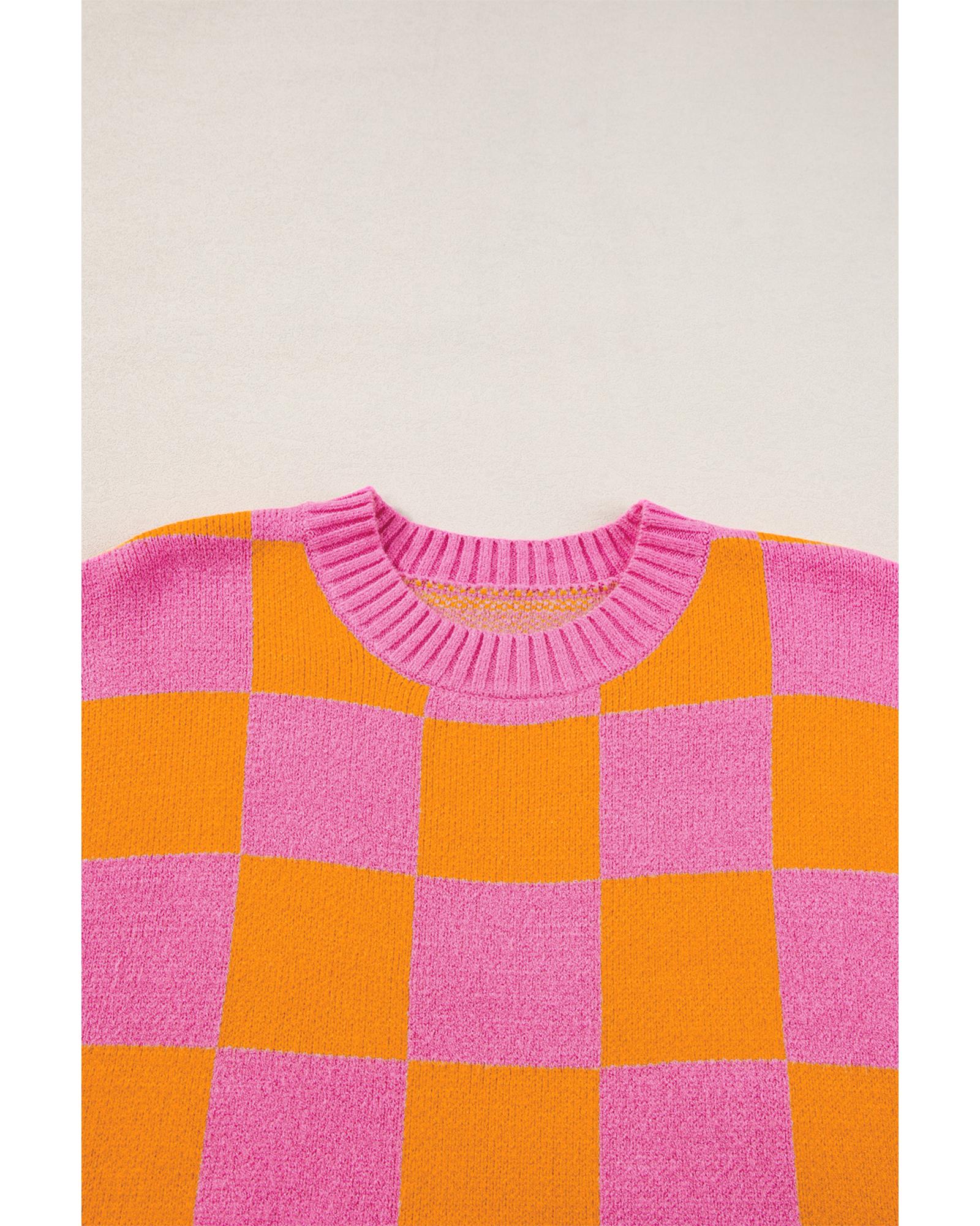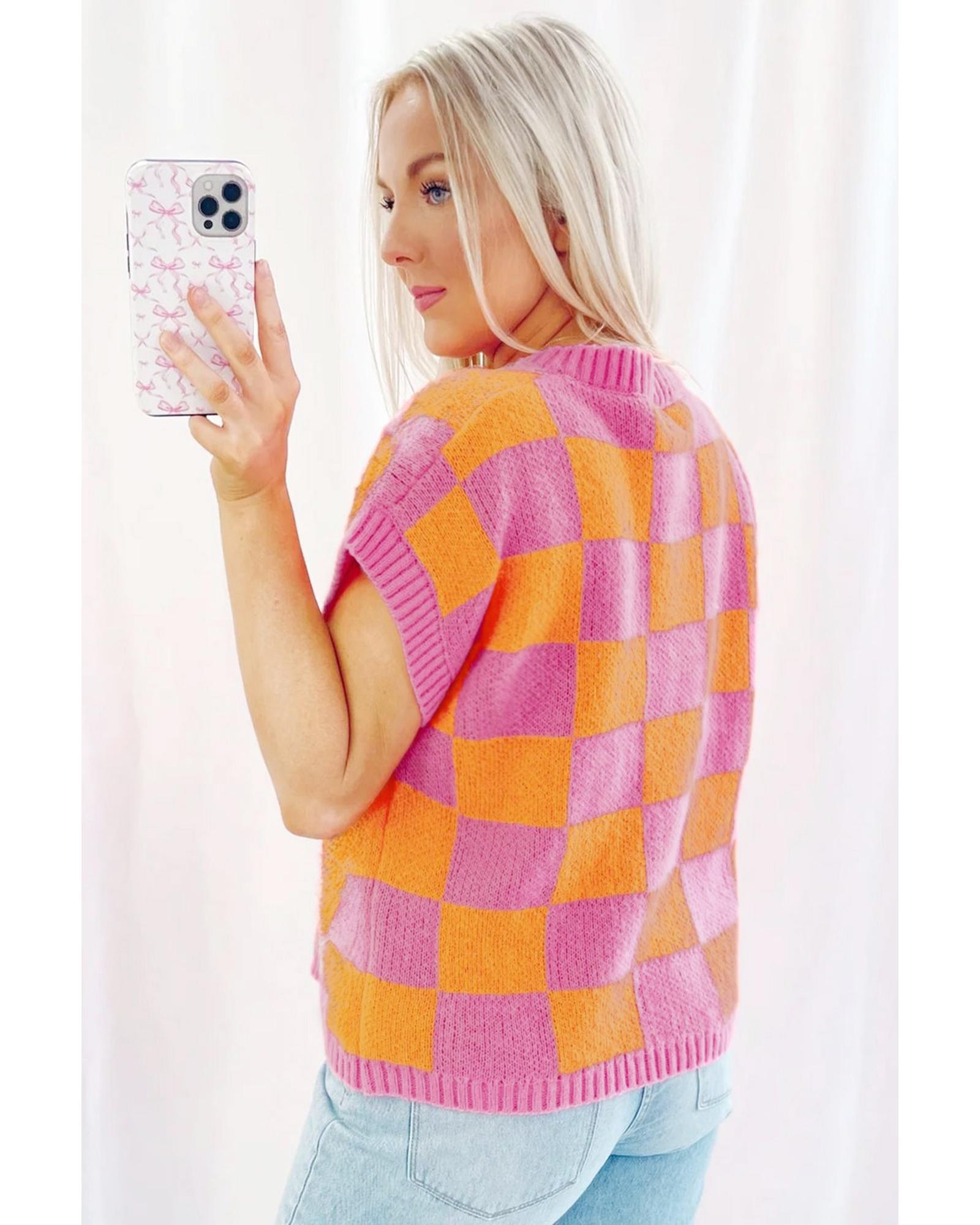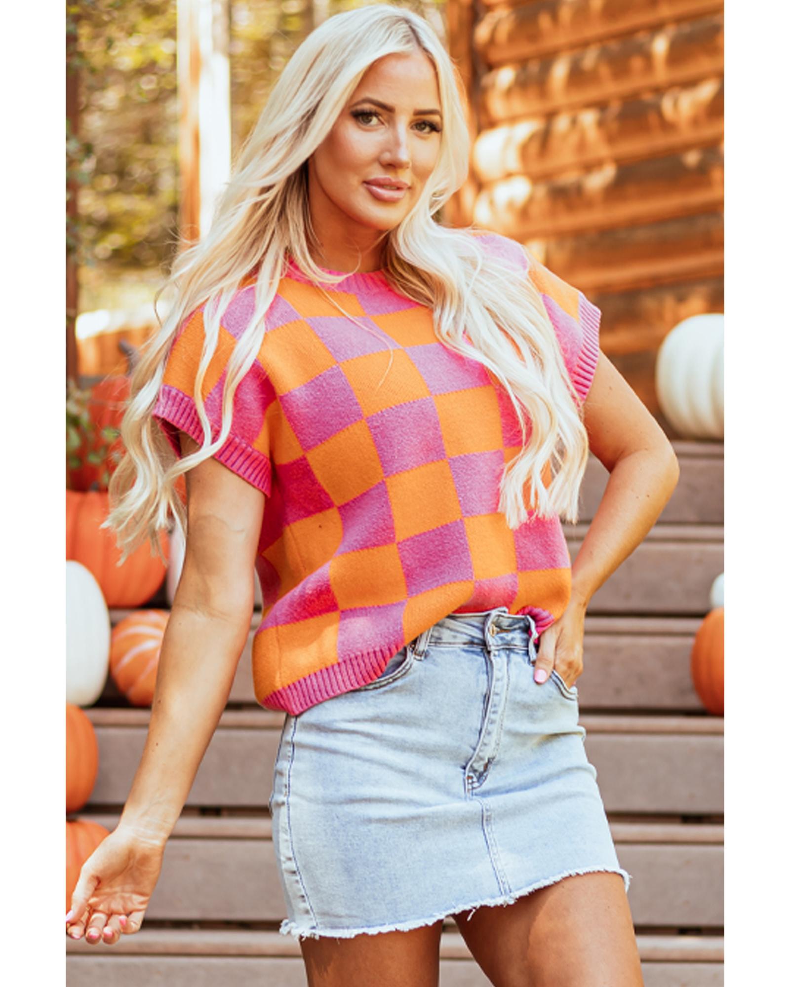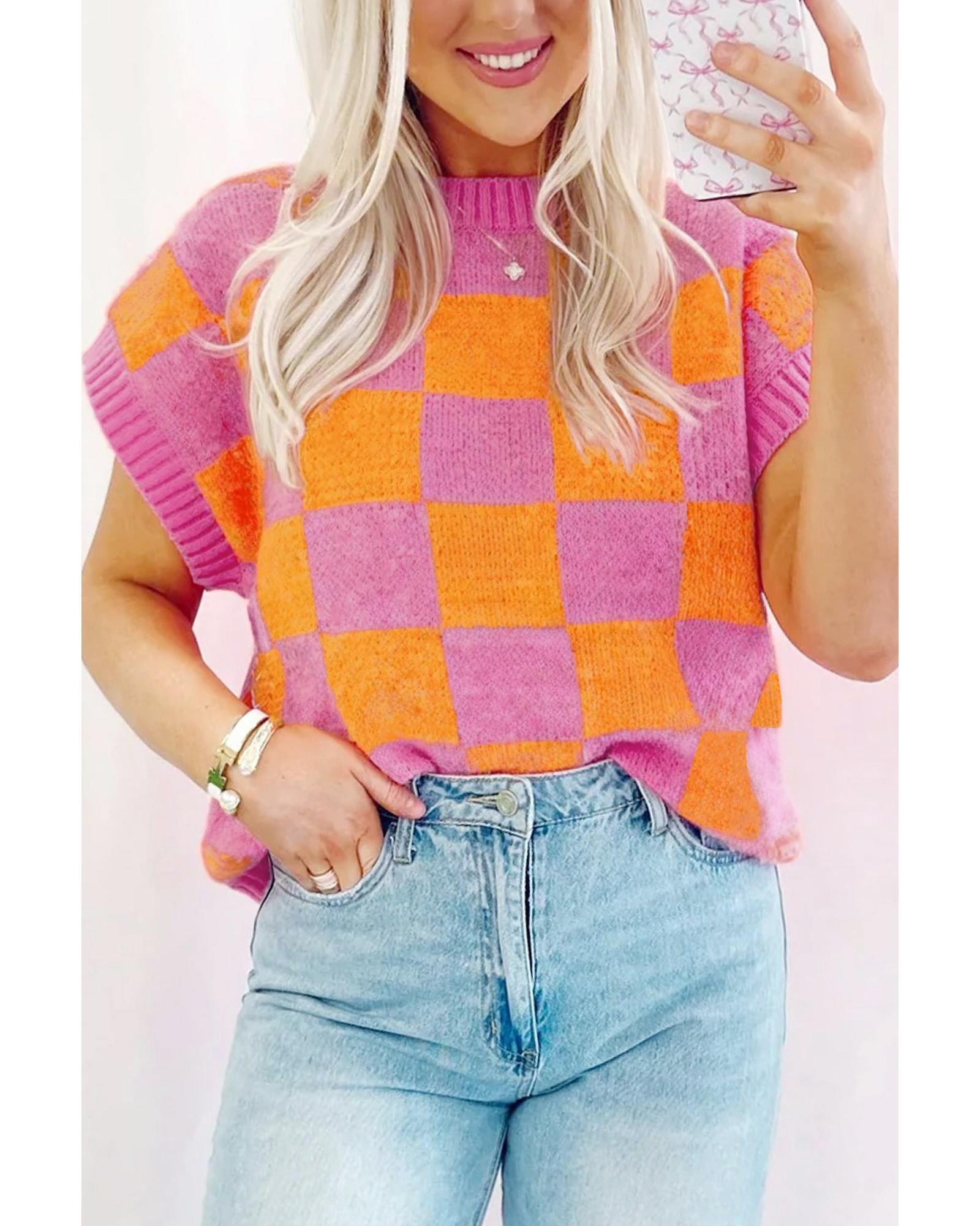 Strawberry Pink Colorblock Plaid Pattern Ribbed Trim Sweater Tank Top – L