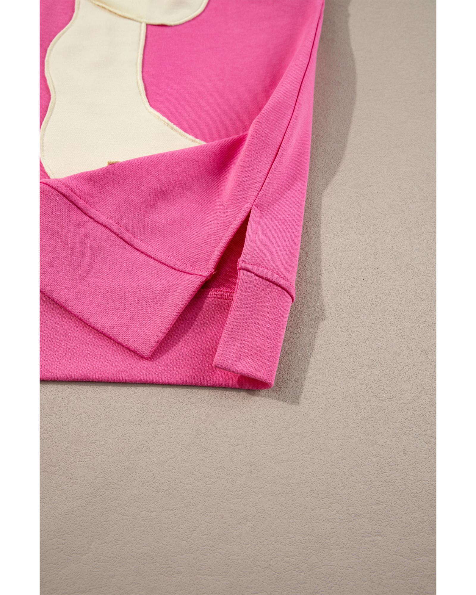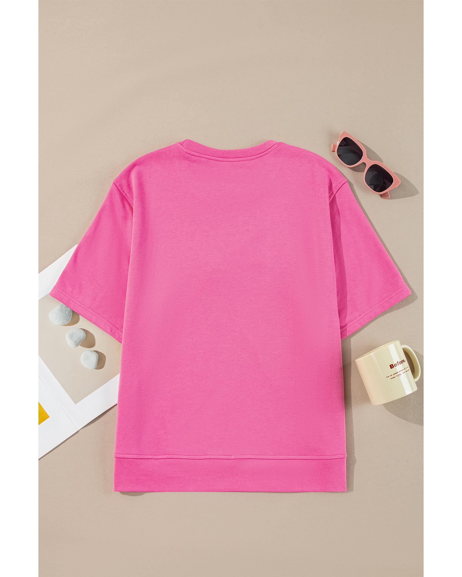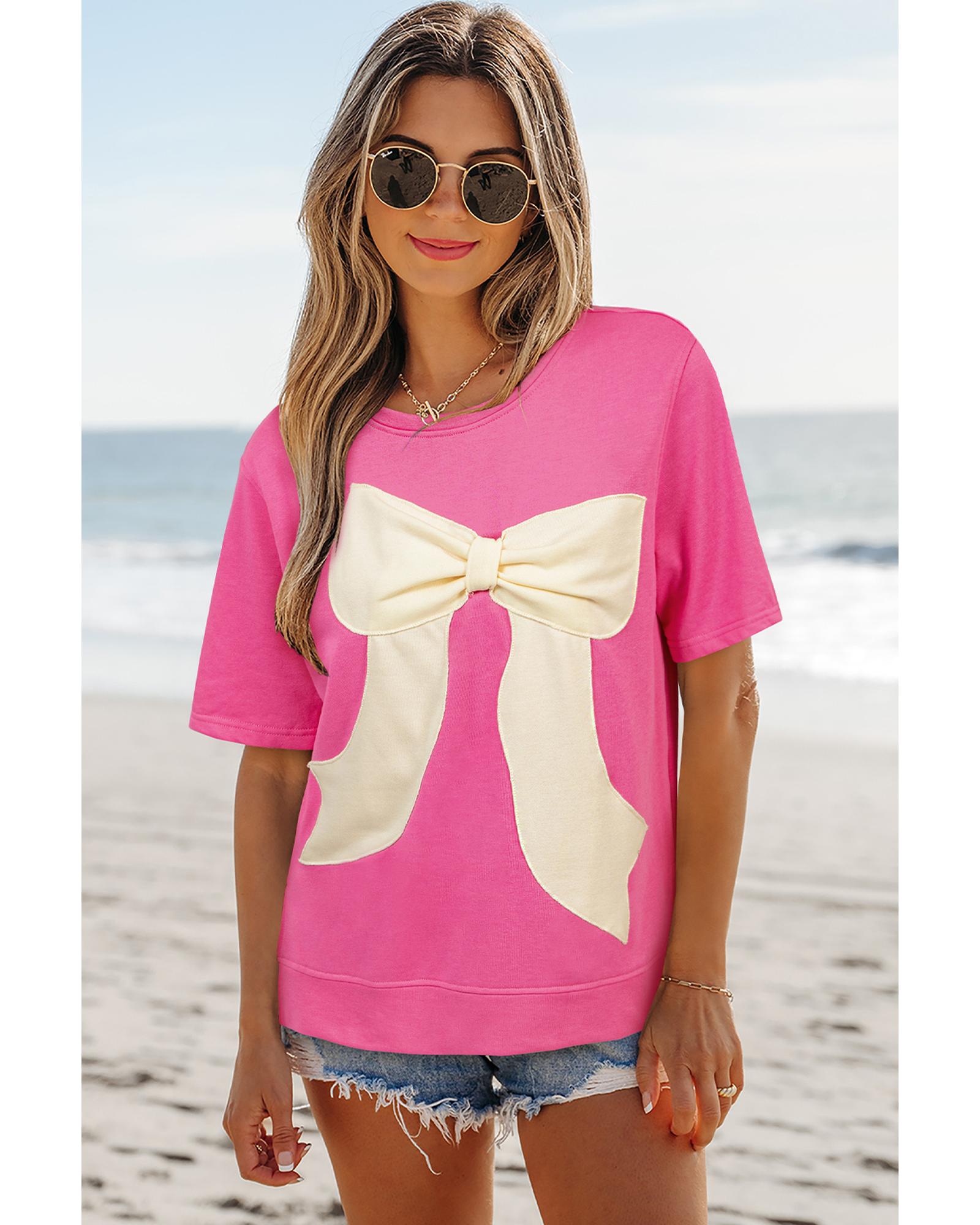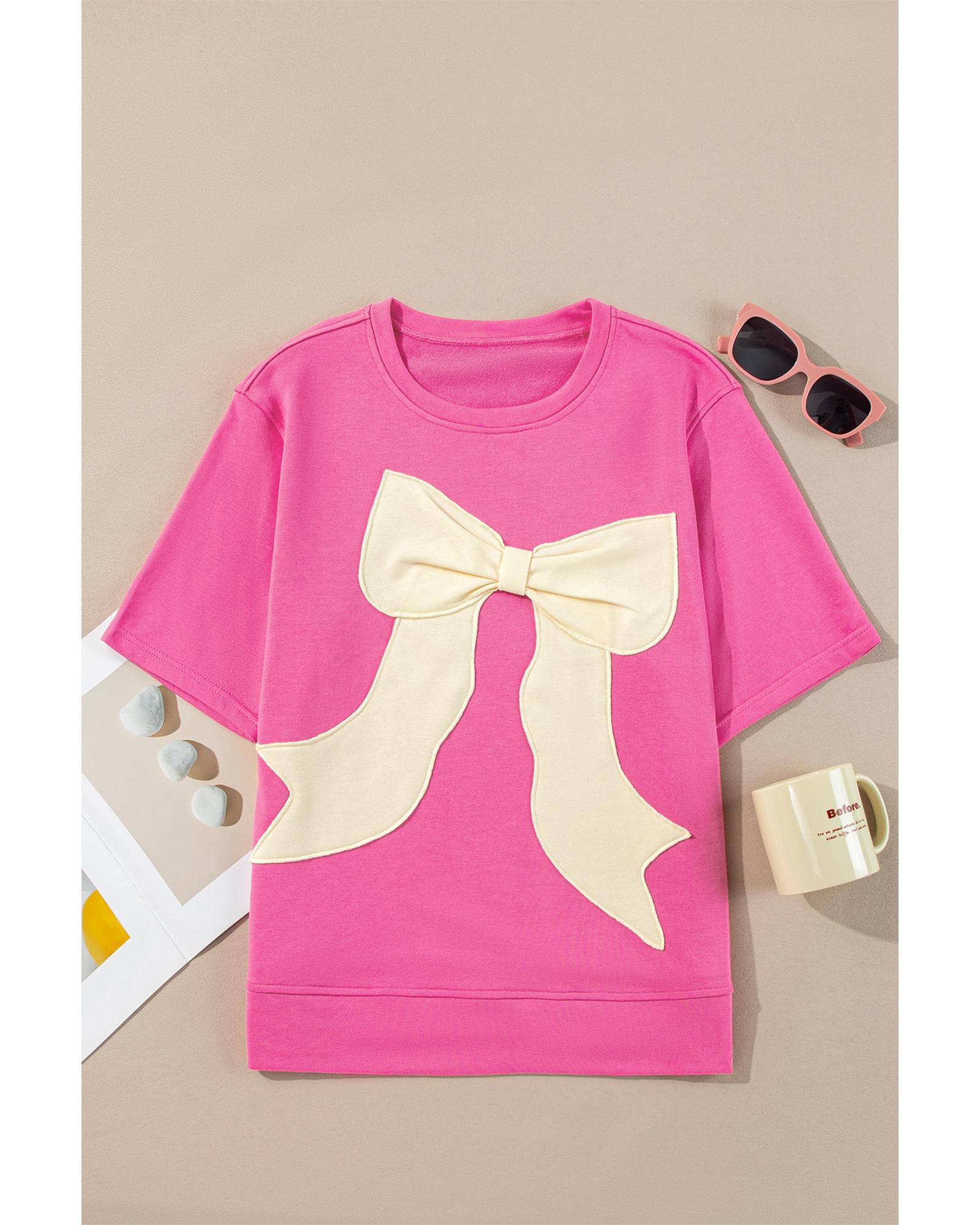 Strawberry Pink Contrasting Color Ribbon Bow Front Patch Loose Tee with Slits – S