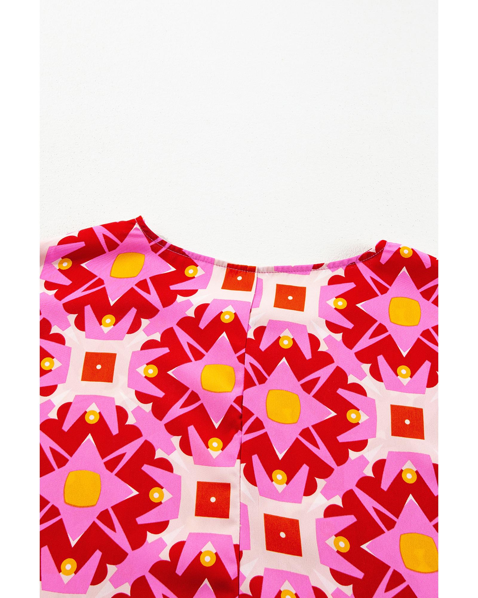 Strawberry Pink Geometric Print Shirred Cuff 3/4 Sleeve Loose Blouse – L