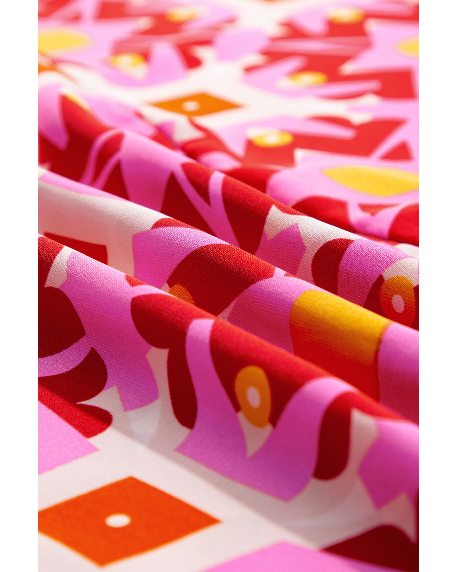 Strawberry Pink Geometric Print Shirred Cuff 3/4 Sleeve Loose Blouse – M
