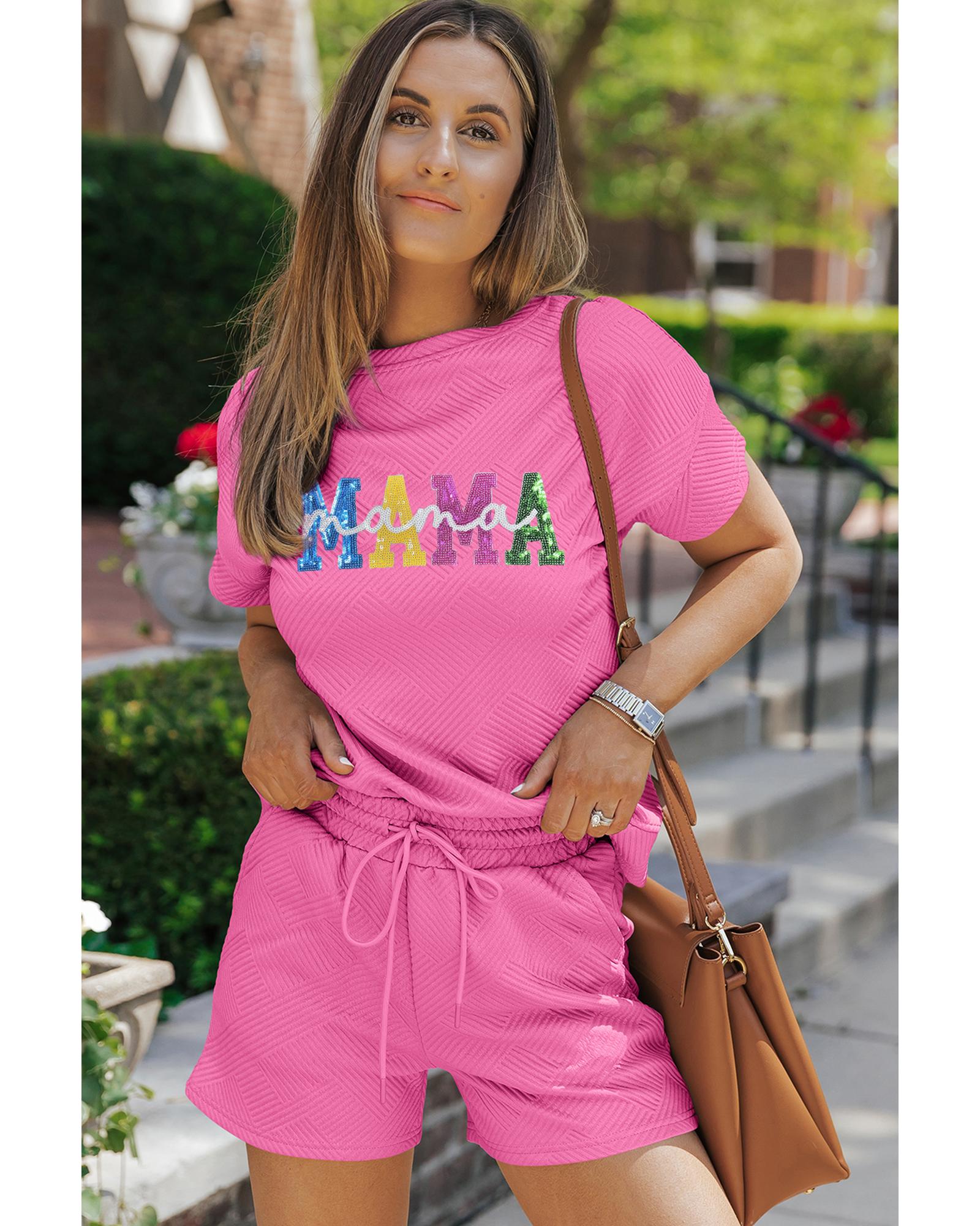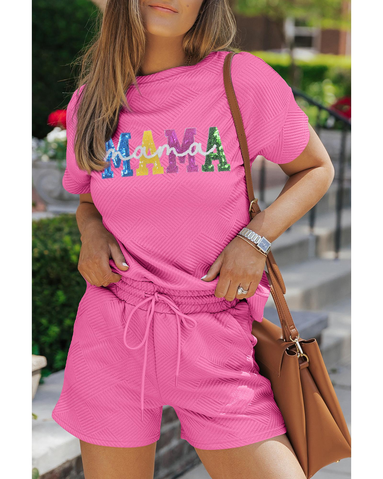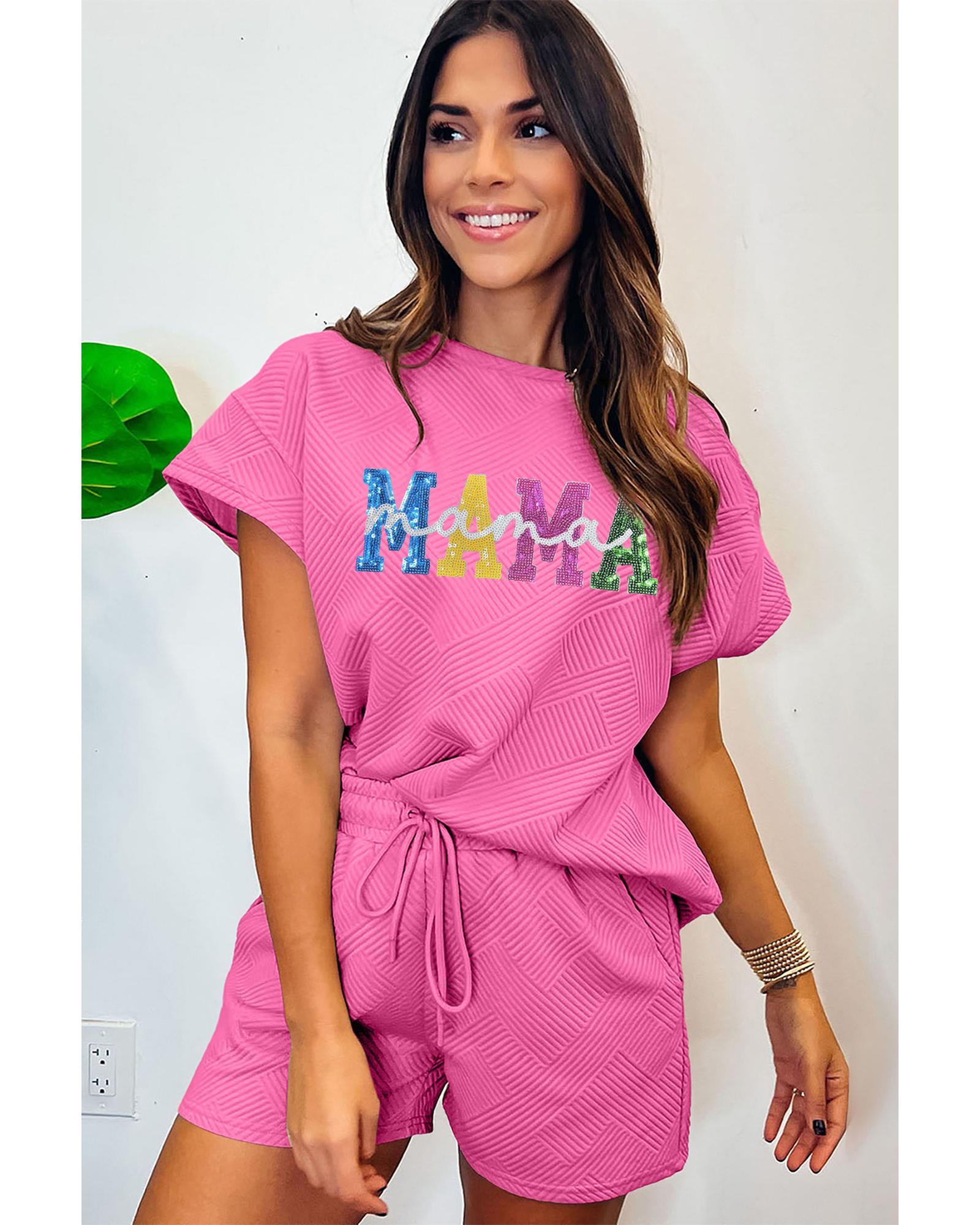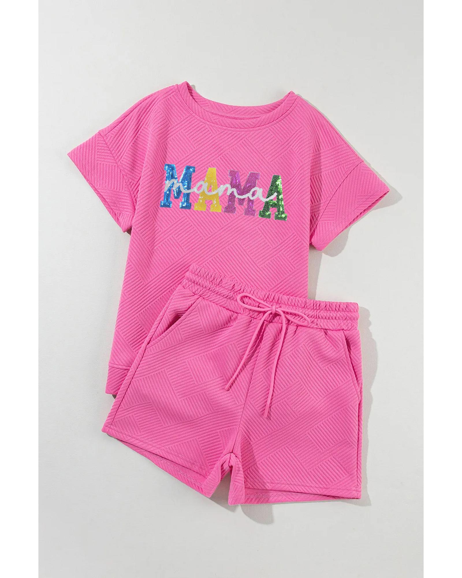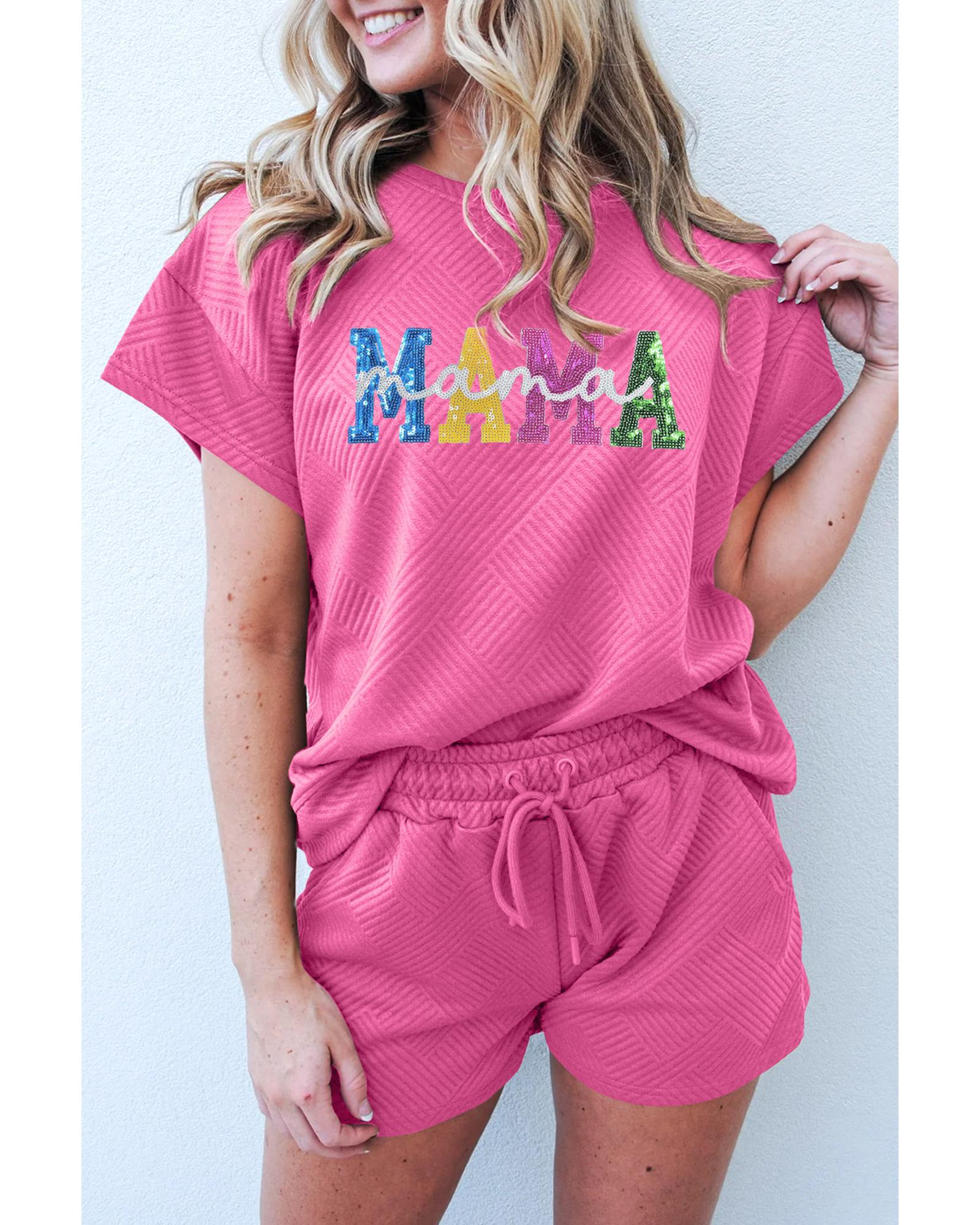 Strawberry Pink Sequined MAMA Letter Graphic Textured Short 2pcs Set – XL