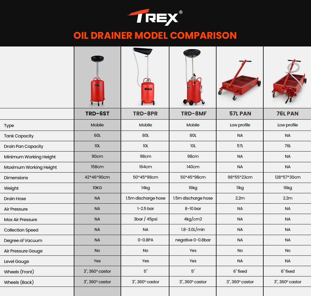 Time for a better way of working? The heavy-duty rugged construction of the T-REX TRD-6ST Mobile Waste Drainer with its large 60L powder-coated holding tank make it ideal for quickly and efficiently draining, storing and transferring of motor engine oil, transmission fluid, coolant, differential and other fluids from motor vehicles.