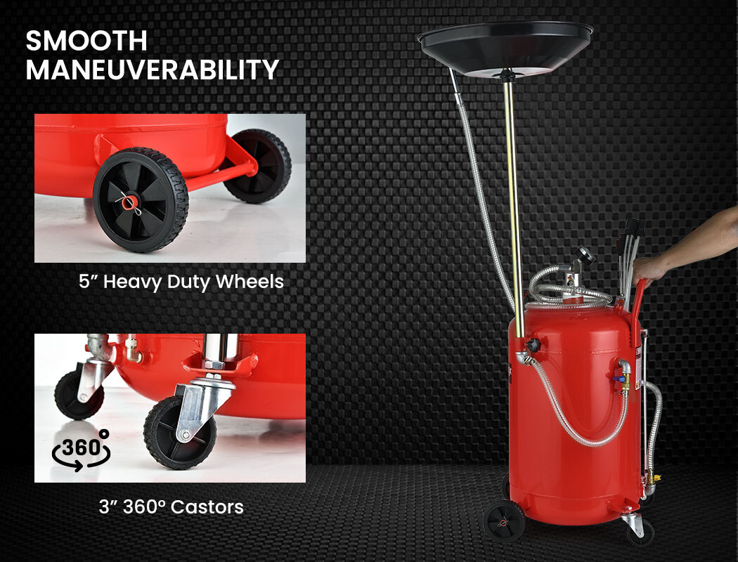 Its multifunction design allows for traditional gravity assisted waste oil extraction, or you can connect an air compressor for fast pneumatic vacuum suction directly from a vehicle transmission via a dipstick tube. It comes equipped with 6 different sized dipstick tubes for waste oil suction, in order to suit almost every engine model and manufacturer!