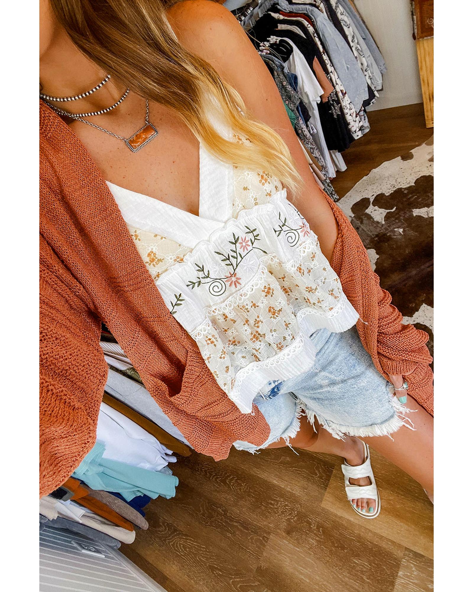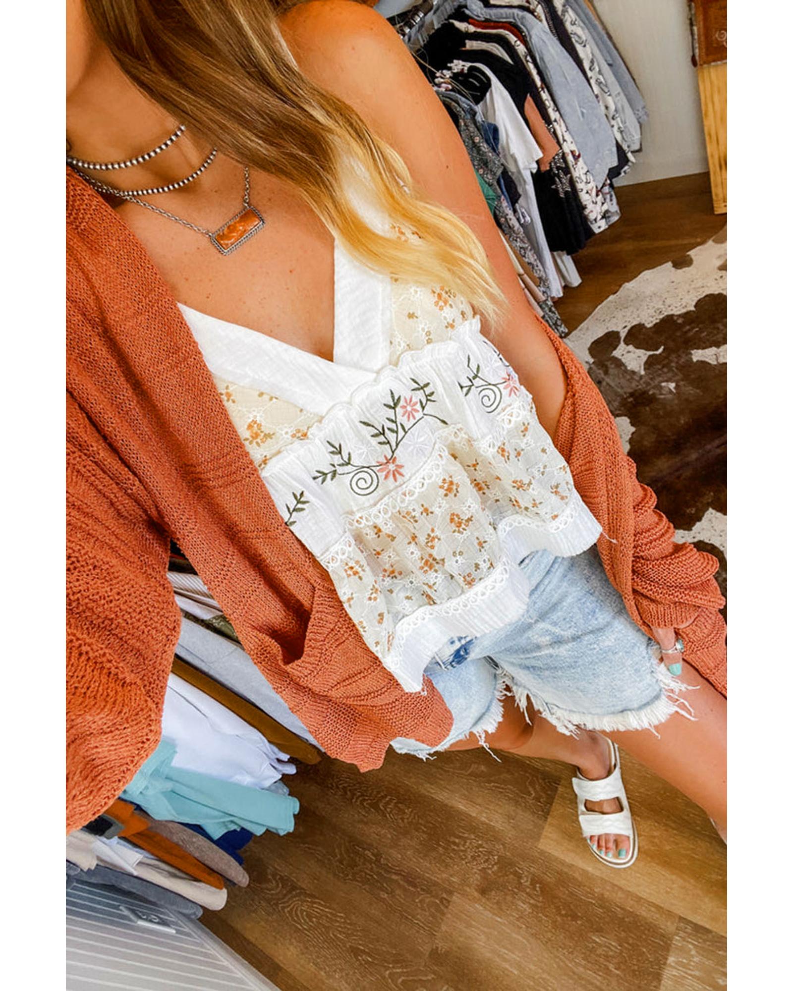 Tomato Red Open Front Textured Knit Cardigan with Pockets – M