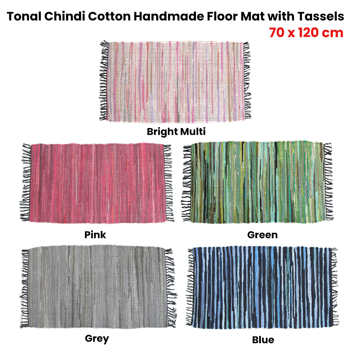 Bring a touch of style to your home with the Tonal Chindi Cotton Handmade Floor Mat with Tassels 70 x 120 cm! Handmade woven floor mat with random pattern, tassels are uneven length. This unique mat features woven design with a playful tassels accent that adds a touch of whimsy, and the soft cotton feels great under bare feet. A beautiful, textured floor mat that’s as easy on the eyes as it is on your feet.