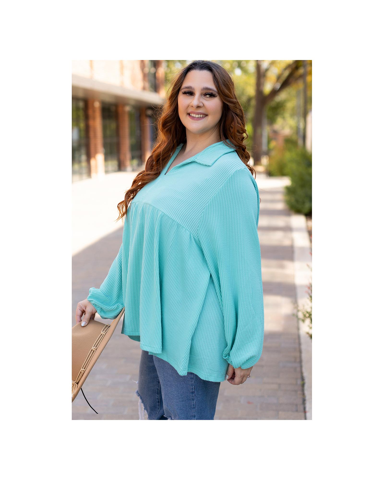 Turquoise Cordrd Balloon Sleeve Collar Plus Babydoll Top – 2X