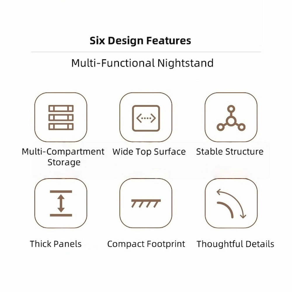 This Nordic-style bedside table features a modern minimalist design, combining warm white with natural wood grain surfaces, creating a cozy and comfortable visual effect. The upper section is designed with open storage areas, including a tray-like top and two separated compartments, perfect for organizing various small items. The bottom section features two spacious drawers with natural wooden round knobs, simple yet warm. The elegant curved side design adds a soft touch, while the four small wooden round legs elevate the overall height, making floor cleaning easier. This bedside table is stylish and practical, suitable for various modern bedroom styles.