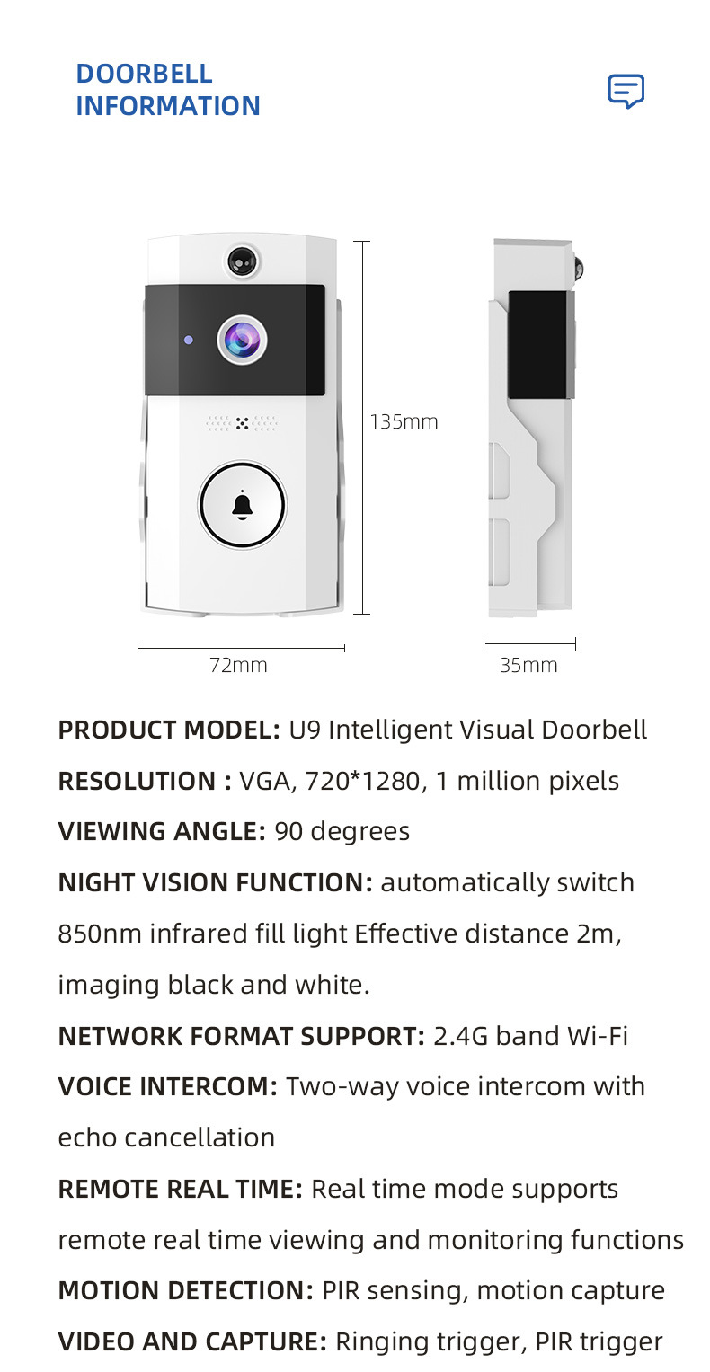 U9 Visual Doorbell HD Wireless Video Doorbell with Long-Lasting Battery