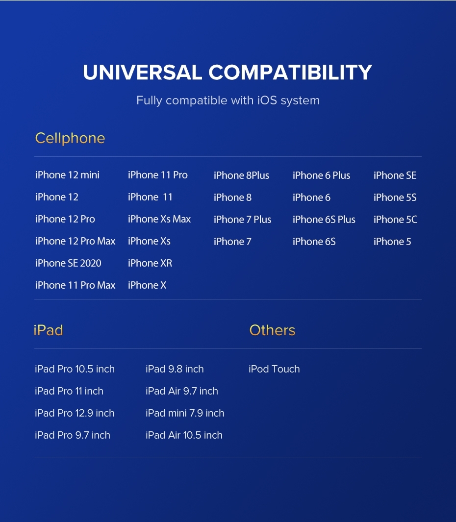 The charging cable is Approved by MFi certification, and strict quality control ensure that your iPhone devices are loaded and charge safely at maximum speed. Adopt tinned-copper core to enhance the heat-resistant, no interference to your phone signal, ideal for playing mobile game. Compact 8-pin connector fits into most case cutouts.
