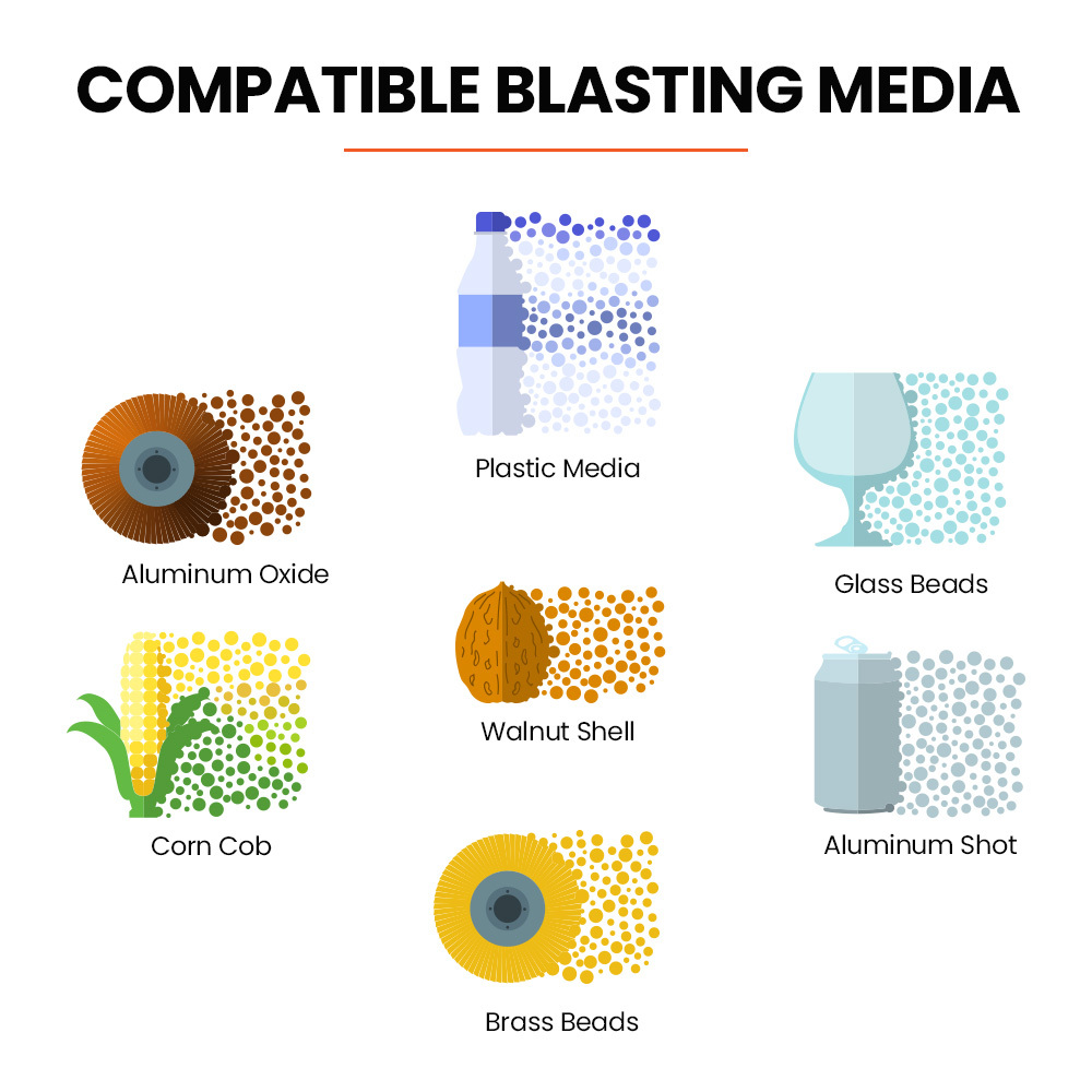 • Sand Types: Glass bead, silicon carbide, alumina, walnut shell, brass bead