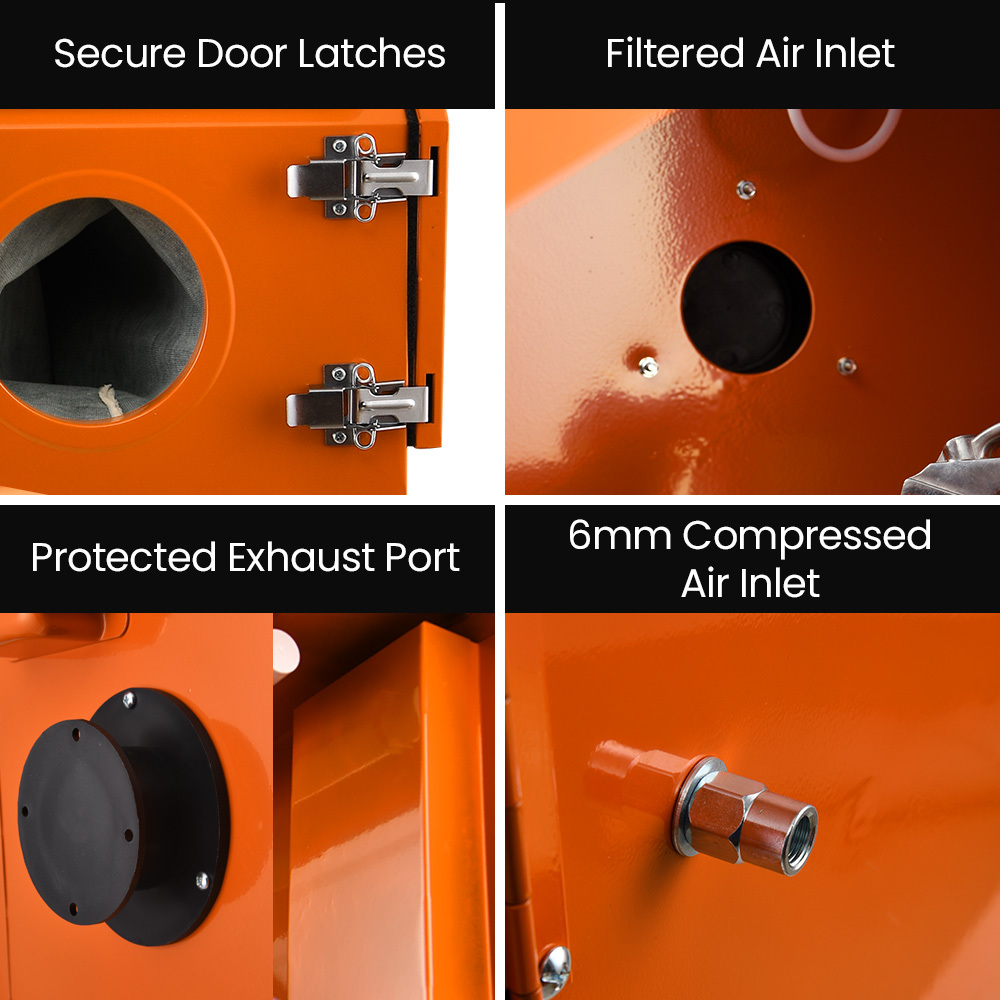 Crafted from steel and finished in a powder coat this cabinet offers superb corrosion and abrasion resistance. The gasket-sealed door keeps your media inside, where it belongs. The pistol grip chrome-vanadium gun has a non-slip handle and changeable ceramic tip.
