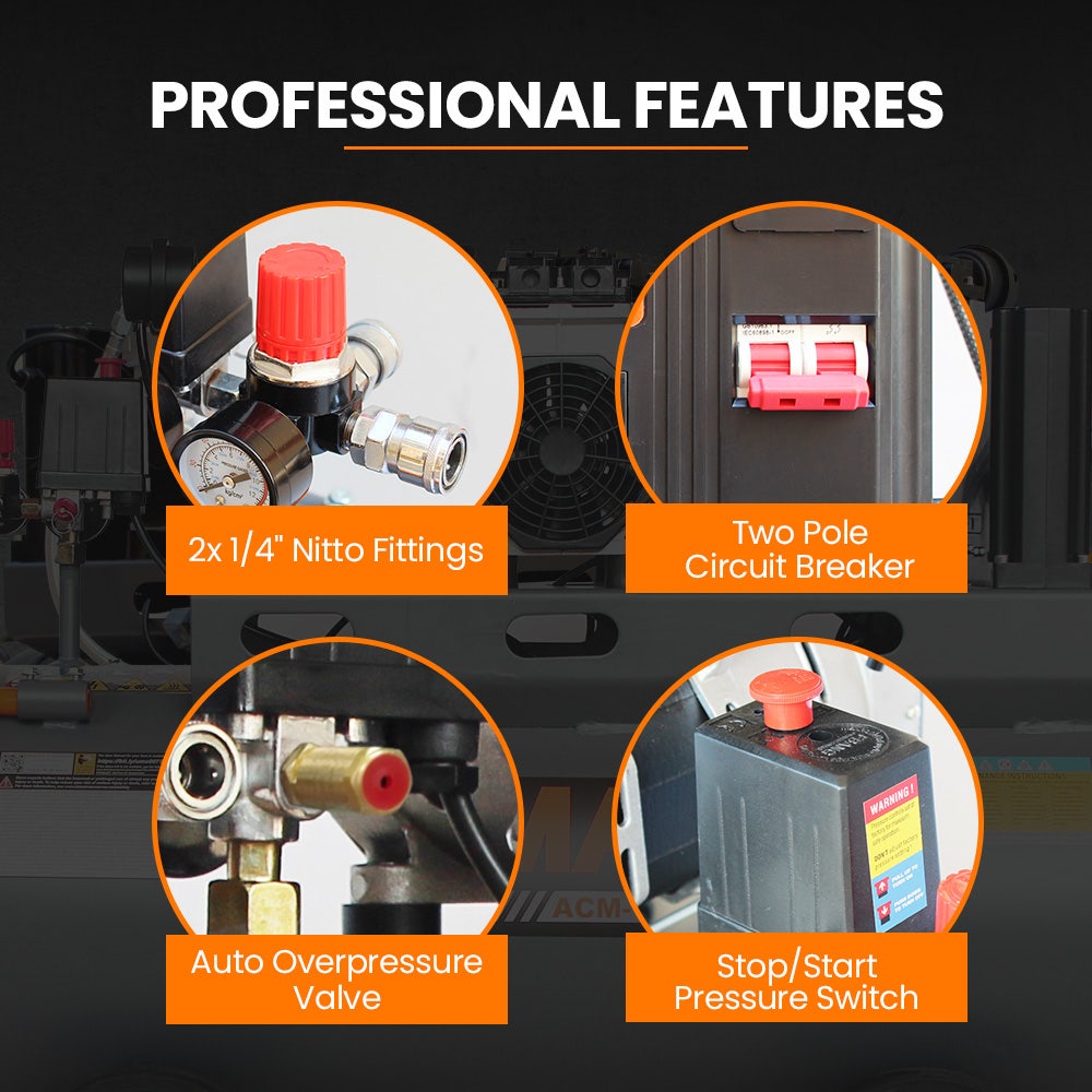 Unimac 150L 4.5HP Ultra-Slient Oil-Free Electric Air Compressor, Long Life Quad Motor, 116PSI Portable Heavy Duty, Twin Nitto Outlets, 15A Plug