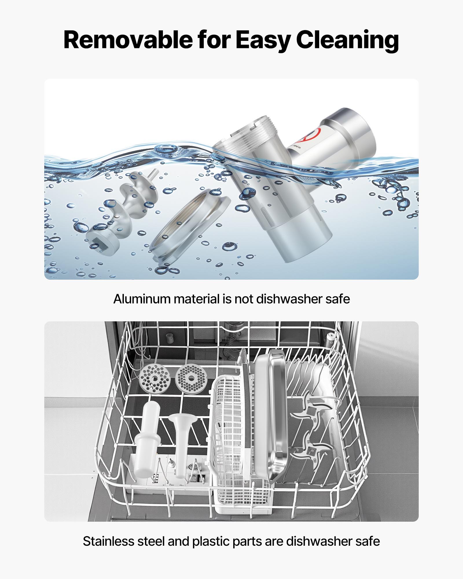 The electric meat grinder is made of carbon steel and stainless steel, with sharp SUS420 blades that are durable and capable of grinding chicken cartilage, frozen meat, and more
