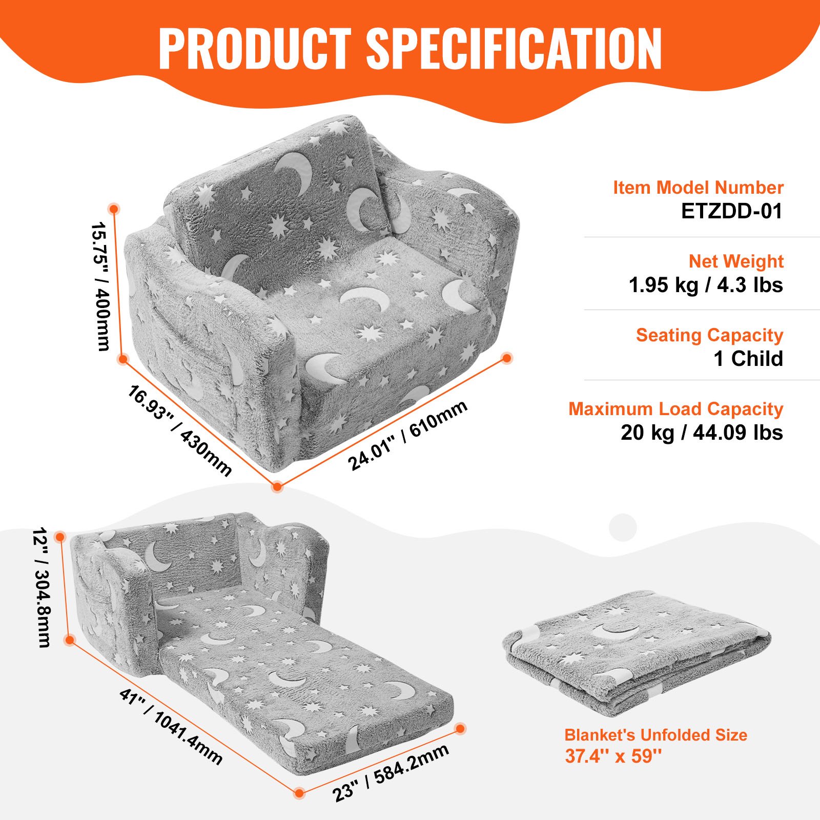 VEVOR Fold-out Kids Sofa, Glow-in-the-Dark Kids Couch Chair, 2-in-1 Children Convertible Sofa to Lounger, Extra Soft Flip-out Toddler Couch for Siting and Sleeping, for Bedroom and Playroom