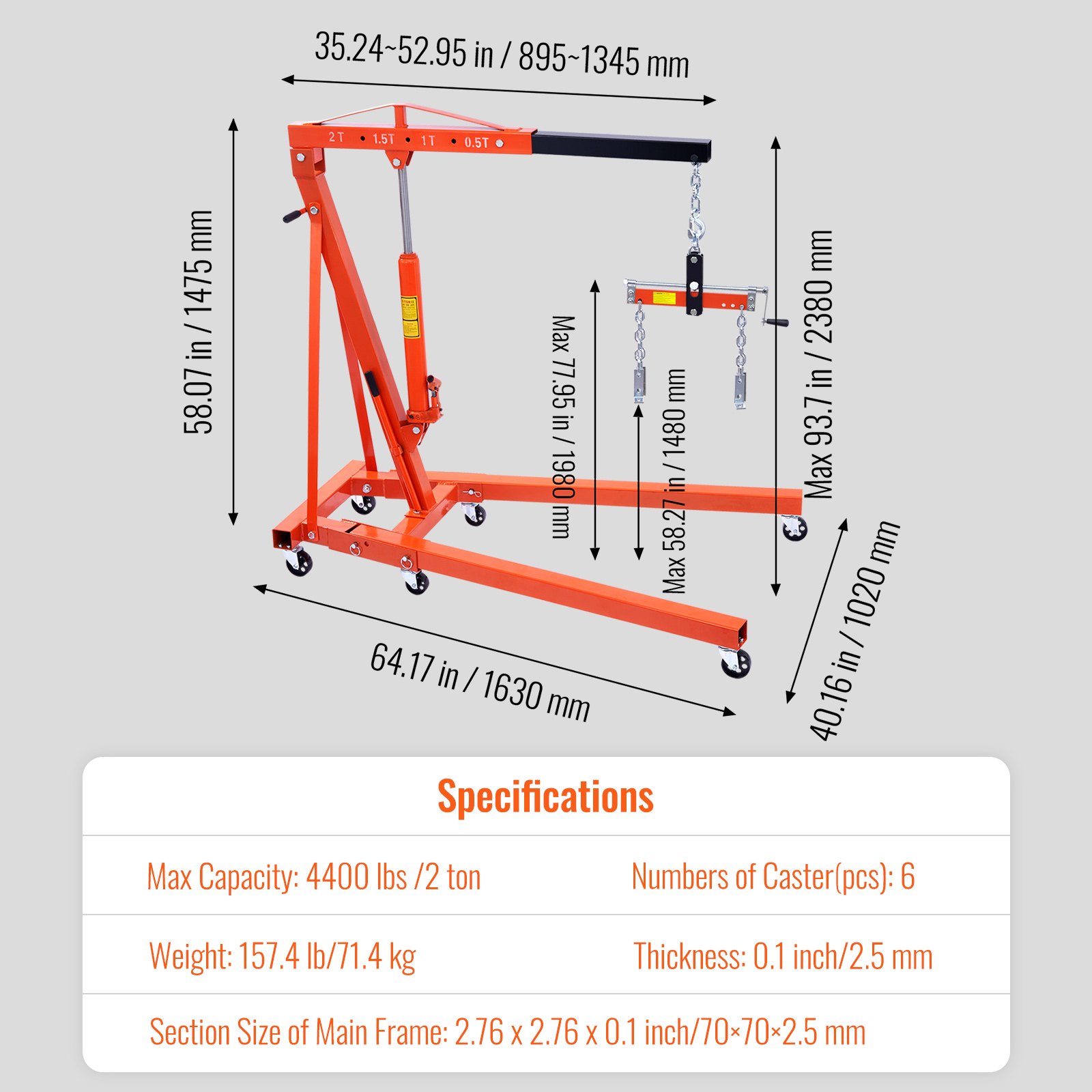 VEVOR’s hydraulic engine hoist has a powerful engine crane and a standard leveling tool. Say goodbye to the hassle of purchasing separate equipment, as our 2-in-1 engine hoist provides everything you need for a time-saving and labor-saving experience.