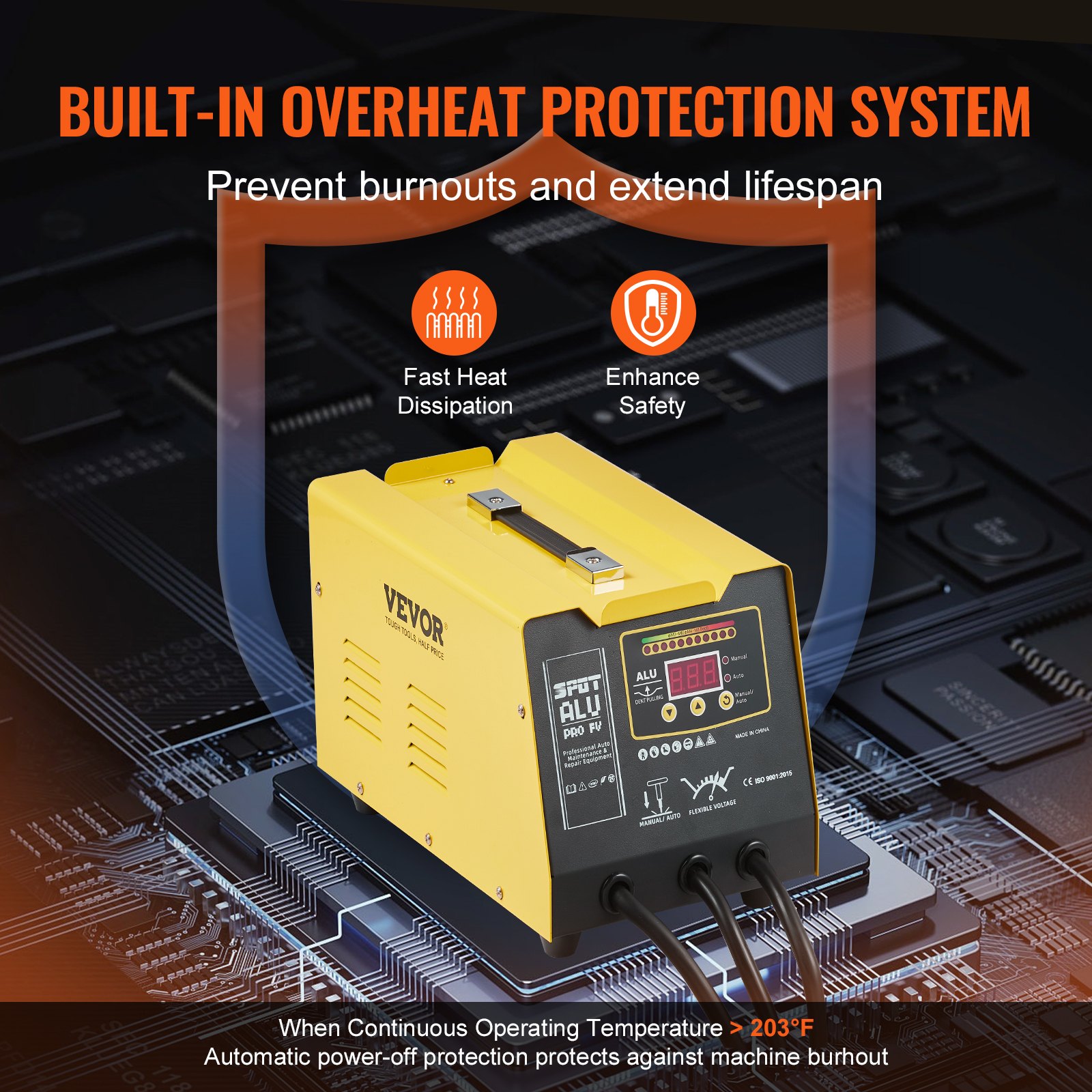 Featuring a ceramic insulation system, this stud welder automatically shuts down when the temperature exceeds 203_, preventing machine damage or burning. Side vents also ensure fast heat dissipation, further prolonging the machine’s life.