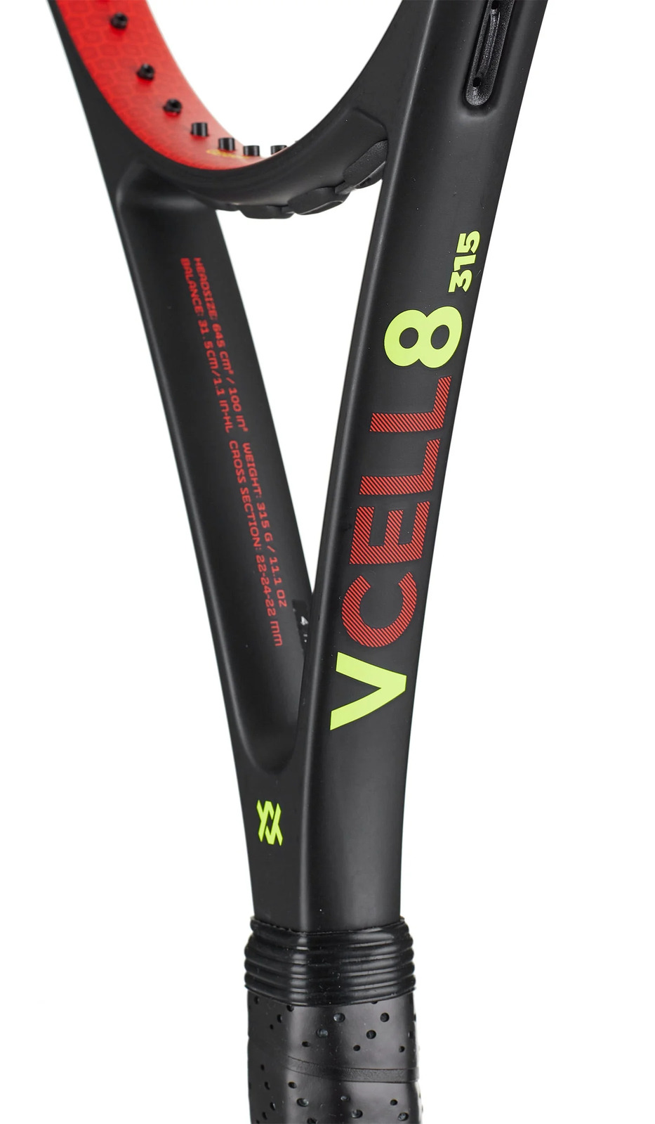 String Tension: 50-60 poundsThe V-Cell 8 315g replaces the V-Feel 8 model. Like its predecessor, this racquet was designed to give intermediate and advanced players a powerfully precise and spin-friendly weapon. At 11.6 ounces strung, it is a tad heavier and more stable than the V-Feel 8 300g, but it packs a sub 320-RDC swingweight, giving it explosive acceleration and impressive speed in the front court. For this update, Volk adds extra V-Cell material (a cellulose based carbon) to the shaft and head for a more comfortable, stable and responsive hitting experience.Like the previous generation, this racquet’s butt cap and innovative REVA based handle system have been meticulously designed to deliver a smoother, more arm-friendly feel at impact. On groundstrokes, this stick swings faster than its competitors, making it great for the experienced player who craves raw speed over stability. The open 16×18 string pattern not only translates into spin-loaded missiles that drop hard, it also delivers a higher trajectory for easier access to depth. Te speedy feel also makes it easy to chase down balls on defense or crank winners on the run. At net this stick offers a crisp and precise response along with very quick handling, making it great on reaction volleys. It also whips very powerfully through contact on serve to deliver easy targeting. With incremental tweaks to the feel, this update is continues to be a great option for aggressive players looking to load the ball with pace and spin.