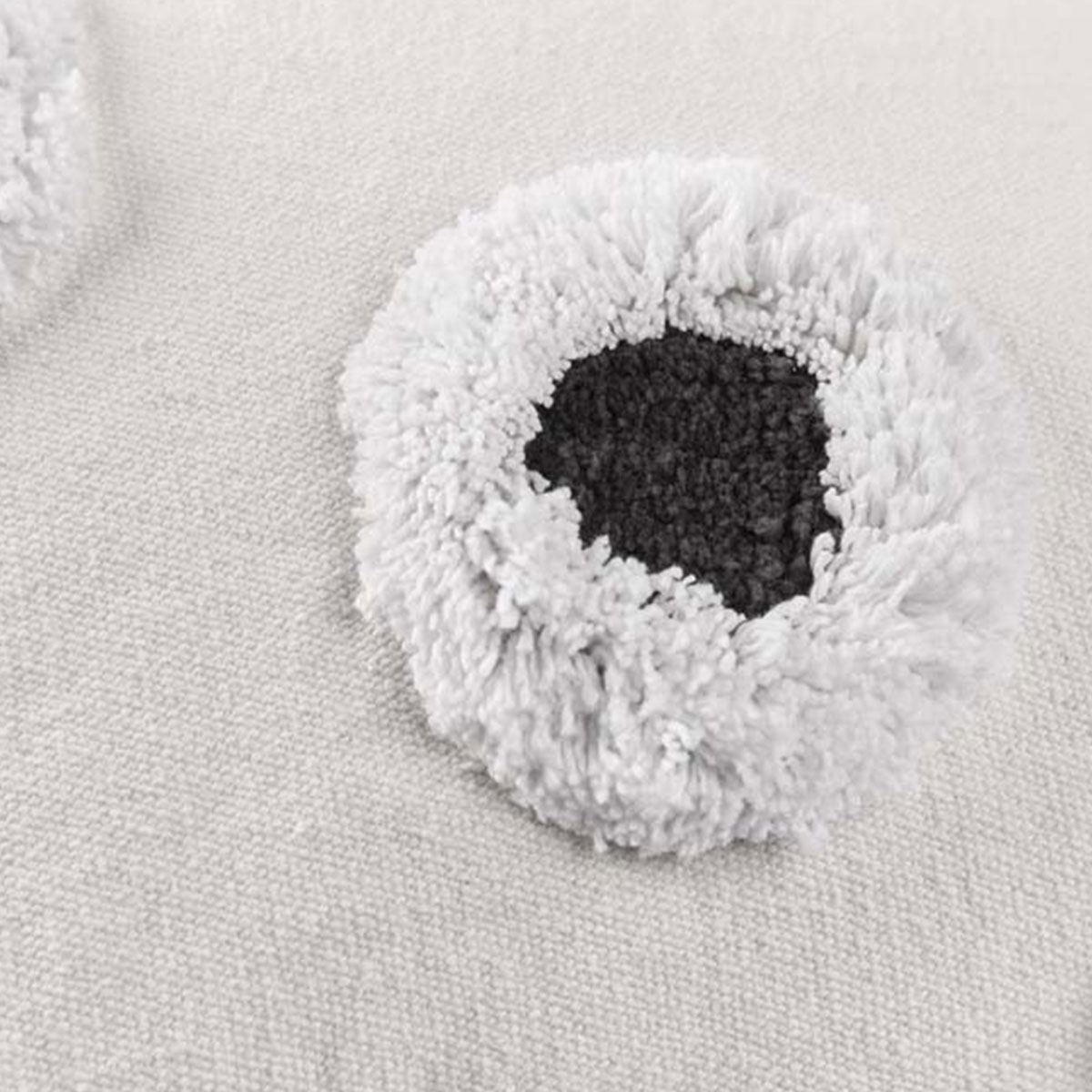 The cushion Stripe and Eye Natural Square Filled Cushion 50cm x 50cm by VTWonen has a print of dots and stripes. The front of the cushion features a print of hand-painted black and white dots against a cream-colored background. The back of the cushion features a print of horizontal black and white stripes. Made from quality cotton fabric and polyester filling.