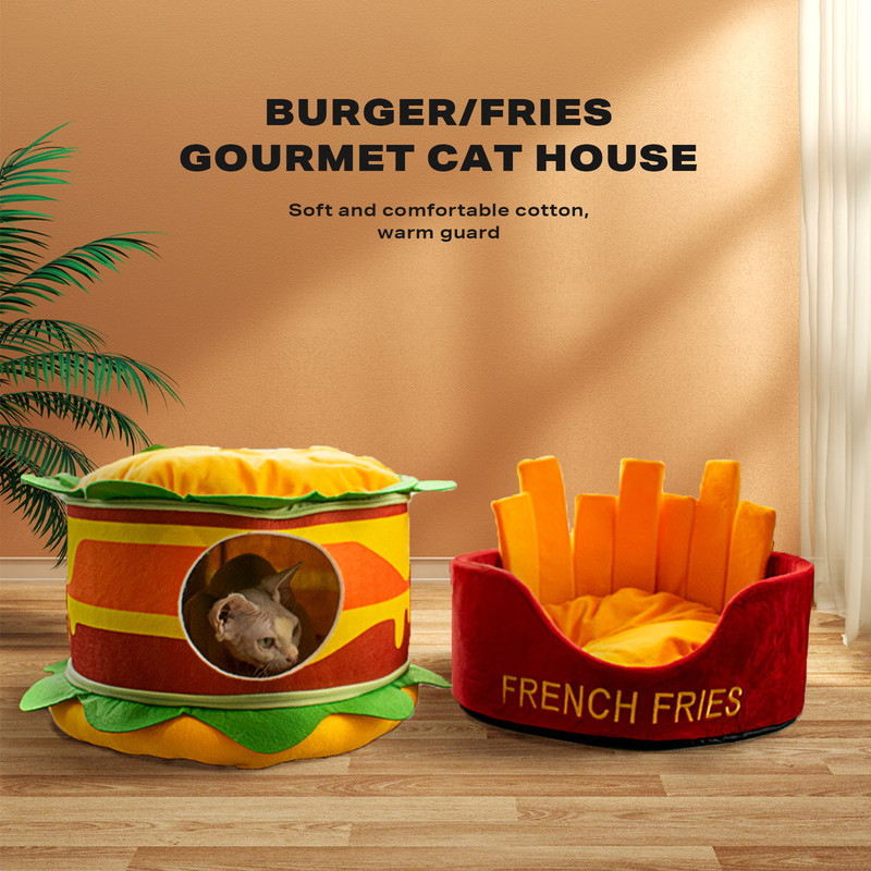【Two sizes can be choose】Unique fries( 45x28cm) and hamburger(45x35cm) design, bright colors are easier to attract pets, in addition, hamburgers can be disassembled into 3 shapes. Suitable for cats up to 15KG.