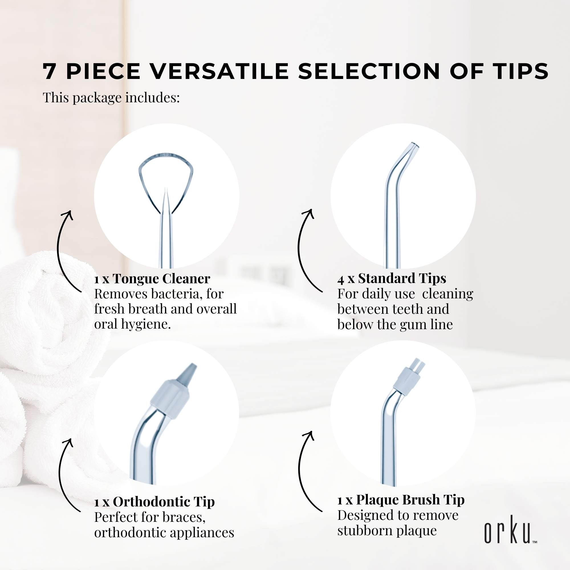 - Comprehensive Nozzle Selection: Comes with 7 nozzles, including 4 standard tips, a plaque brush tip, an orthodontic tip, and a tongue cleaner, catering to all your dental care requirements.