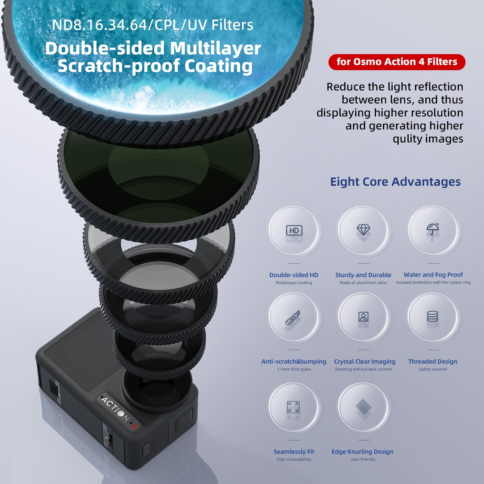 Waterproof Filter for Dji Action 4 Sports Camera – Cpl – Nd8+Nd16+Nd32+Cpl