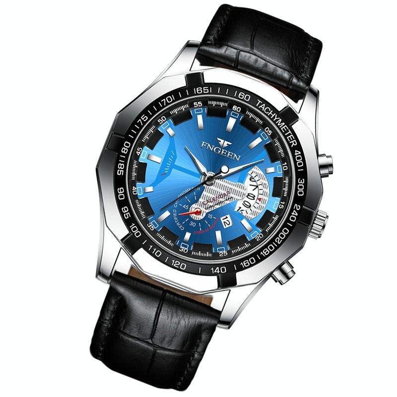 Waterproof Men Calendar Watch – Black Leather White Steel Black Surface