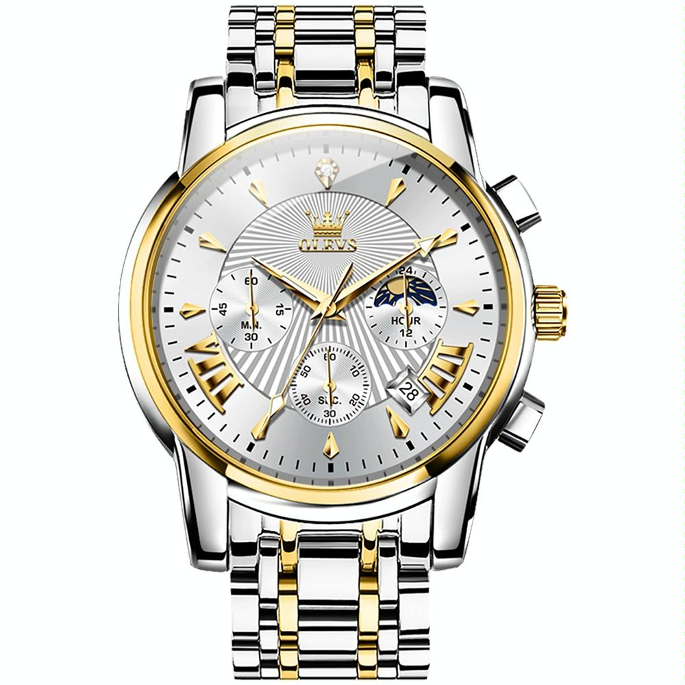 Waterproof Men Quartz Watch – Multifunctional Business Design – White + Gold