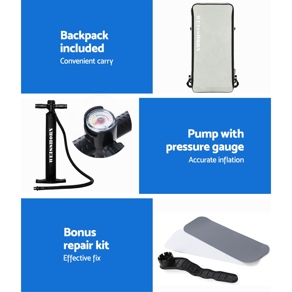 Our Weisshorn Stand-up Paddle Board is designed to suit the beginner paddler as well as a seasoned and easily fits both paddler and passenger for hours of maximum enjoyment. Better still, it is made from durable drop-stitch core material and easy to inflate and deflate, with similar build qualities that you will find with its pricier fibreglass counterparts. It maintains rigidity and toughness with a thickness of 15cm and has a weight capacity of up to 185kg. The supplied 1.7m adjustable aluminium paddle is highly versatile in both paddling and steering while the three fins underneath the board ensure steady gliding, easy manoeuvrability and smooth turning. In fact, one of the fins is removable to give better directional stability. Getting your aquatic escapades started with the paddle board is a simple task of inflating it with the included pump and you are good to row. And because it can be packed away into its handy travel bag, you can take the paddle board just about anywhere you want to go for your water adventures. Also included is a repair kit and a quality adjustable kayak seat that can turn your paddle board into a kayak to enhance your comfort. The kayak seat also comes with a free detachable seat bag where you can conveniently place your personal belongings.